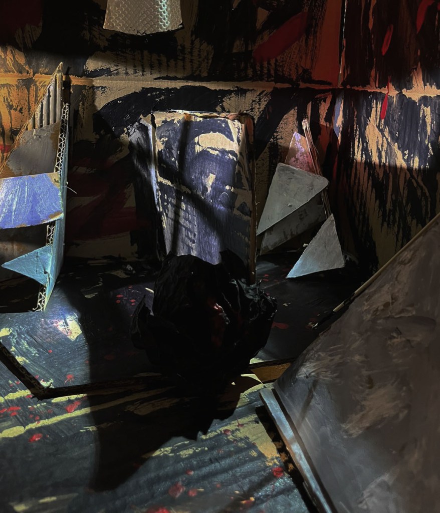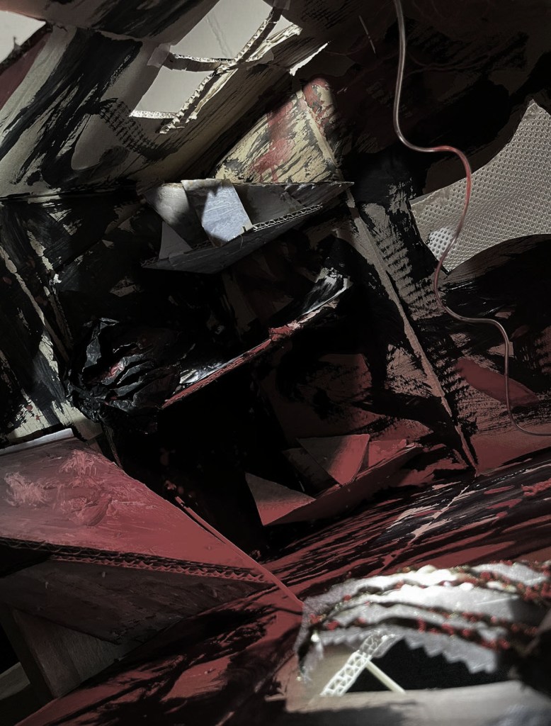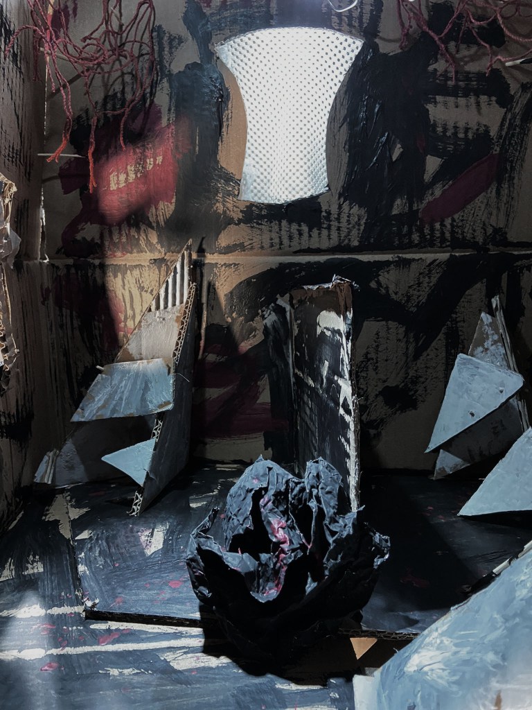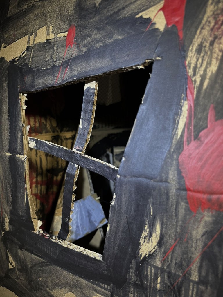 Our model was a representation of the house that was depicted. We made 3 sides of the house to allow for an open side to make it easier to photograph. Also we distorted the shape of house and the windows to add the the eerie feel. We cut the windows out and used different materials to cover them such as a thin fabric to look like a curtain, a thin red plastic and a material with lots of holes on it. On one we added a cross over the window to try make some interesting shadows. We added a range of geometric shapes to represent the objects in a house and create a sense of chaos. Around the top of the model we put wires and a fabric to look like spider webs. All of this paired with the messy red and black paint create the scary, dangerous atmosphere that we understood from the text.