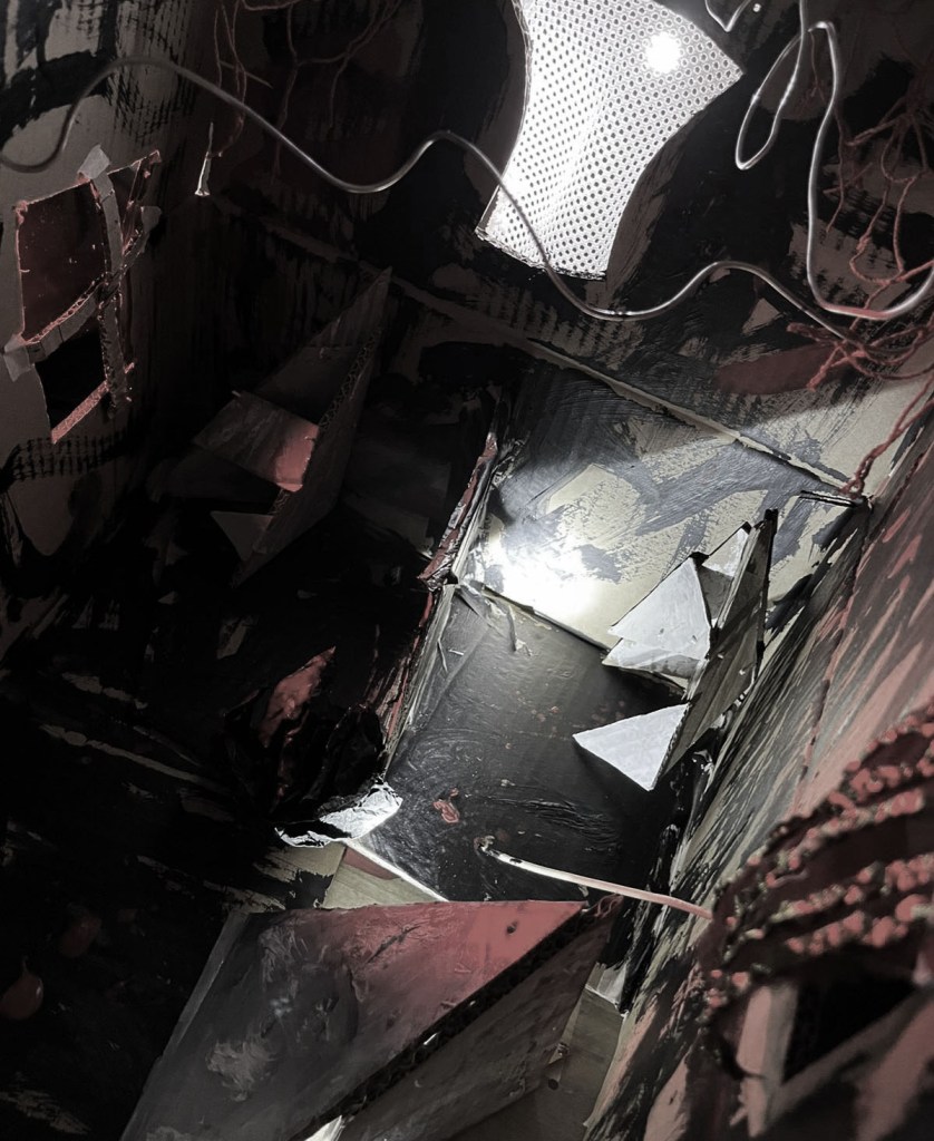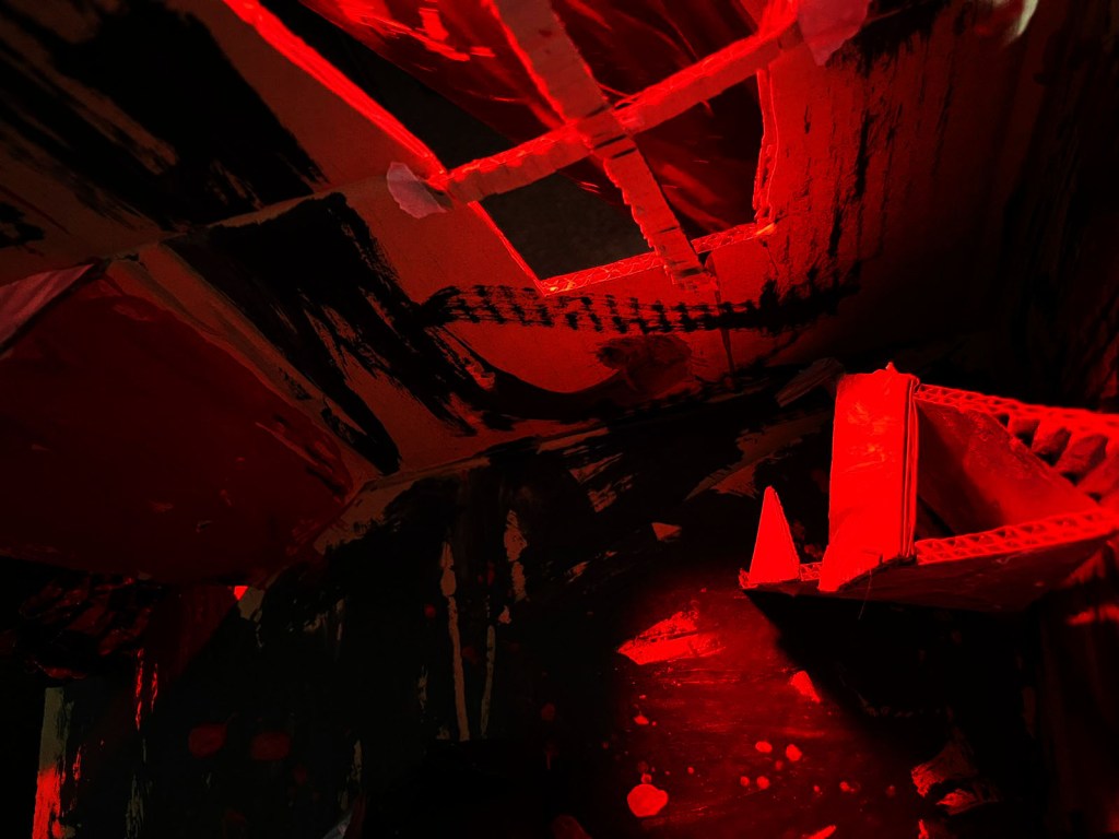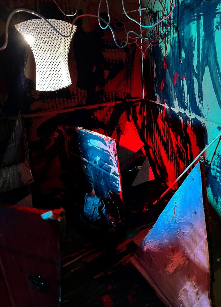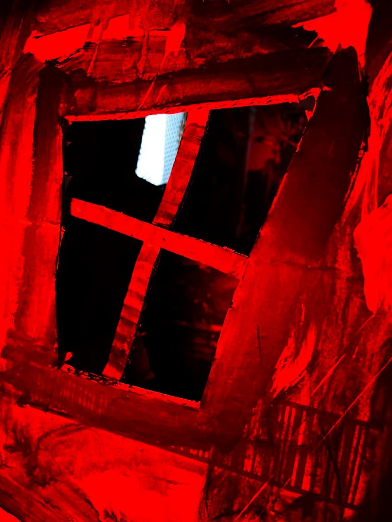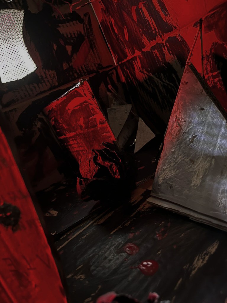 Our model was a representation of the house that was depicted. We made 3 sides of the house to allow for an open side to make it easier to photograph. Also we distorted the shape of house and the windows to add the the eerie feel. We cut the windows out and used different materials to cover them such as a thin fabric to look like a curtain, a thin red plastic and a material with lots of holes on it. On one we added a cross over the window to try make some interesting shadows. We added a range of geometric shapes to represent the objects in a house and create a sense of chaos. Around the top of the model we put wires and a fabric to look like spider webs. All of this paired with the messy red and black paint create the scary, dangerous atmosphere that we understood from the text.