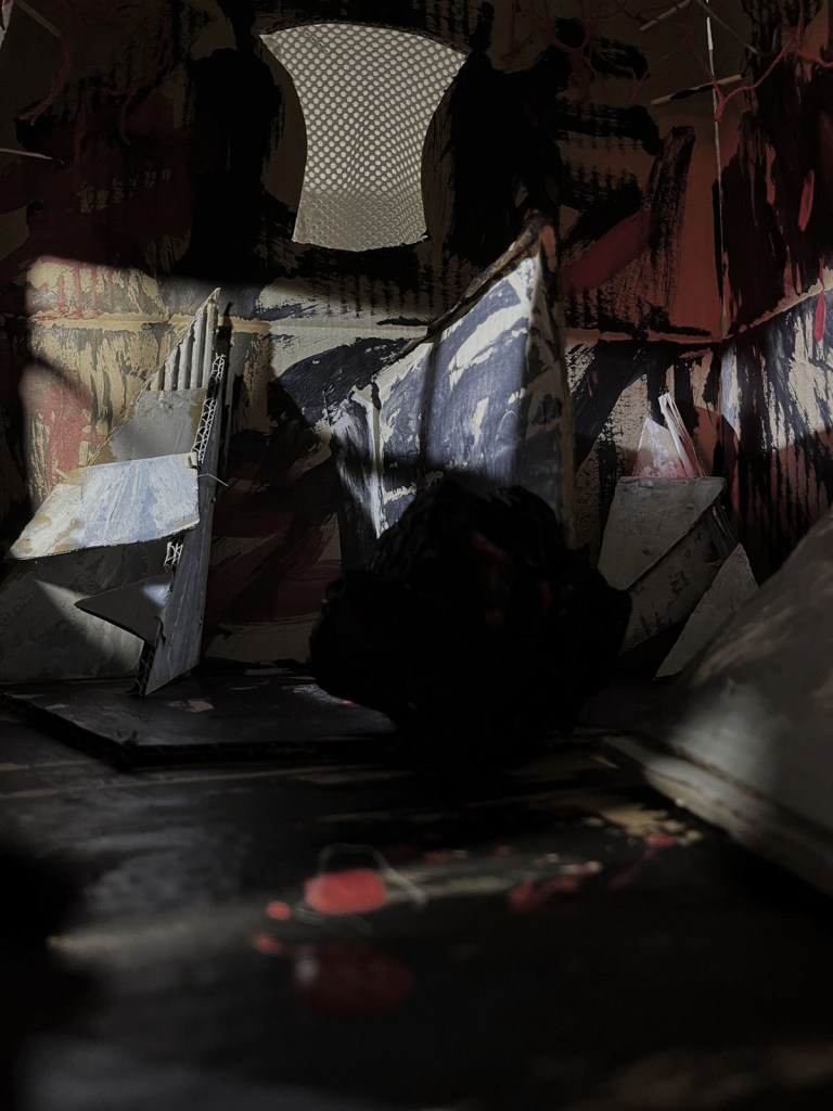 This was a continuation of last weeks work on the story ‘sell your house and buy gold’. We moved on from using figure drawing to represent the emotions and atmosphere of the character in the text to exploring the space depicted in the text. We were split into groups of 4 and made a model using a range of materials which we then photographed using different lighting and angles. In the text the space is depicted as dark, gloomy and very atmospheric as well as with the looming sense of danger and fear. We tried to capture all of this through our model.
