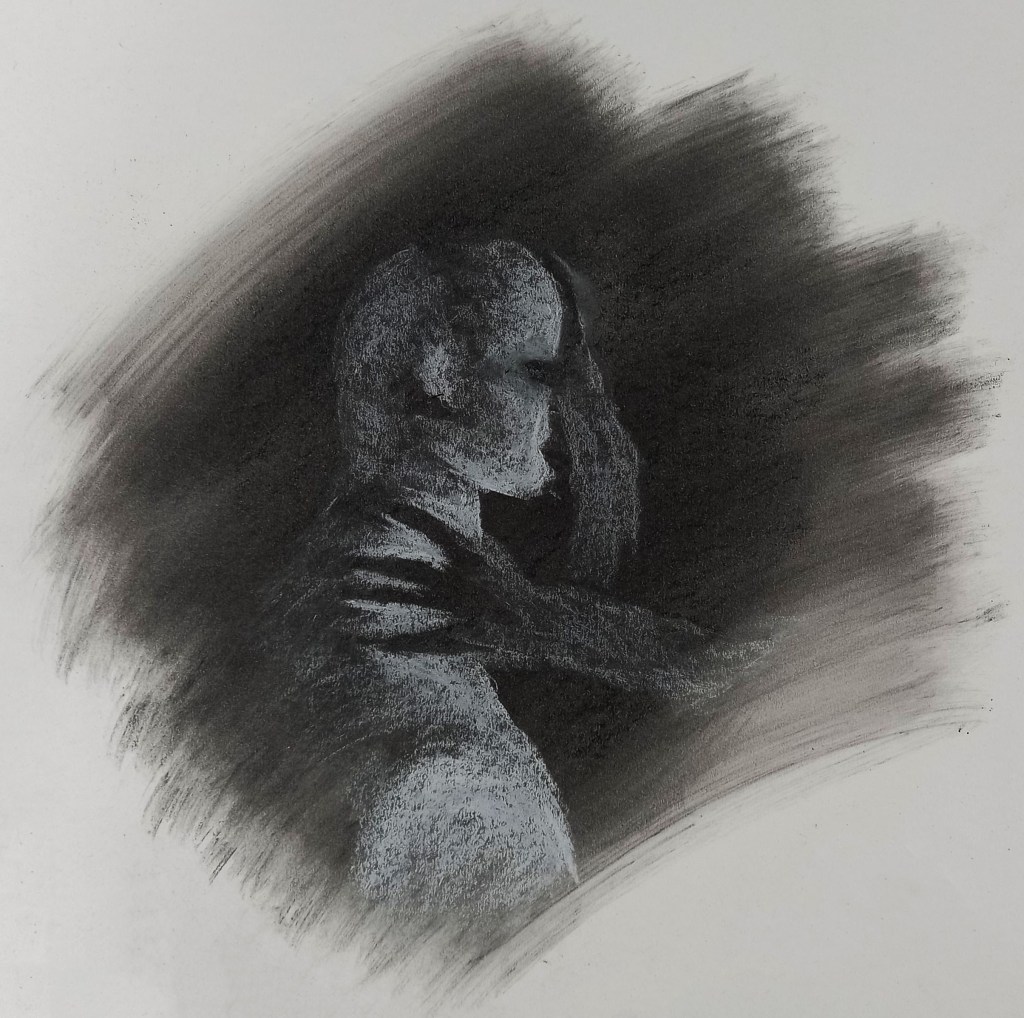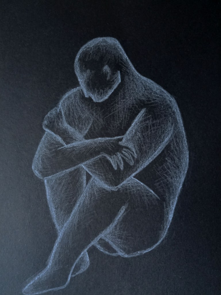 This sitting down hunched over pose is what I decided to use. Using the white pencil I only wanted to add in highlights to create to figure without adding too much detail, especially on the face. I think a minimal figure reflects the theme of the text such as loneliness.