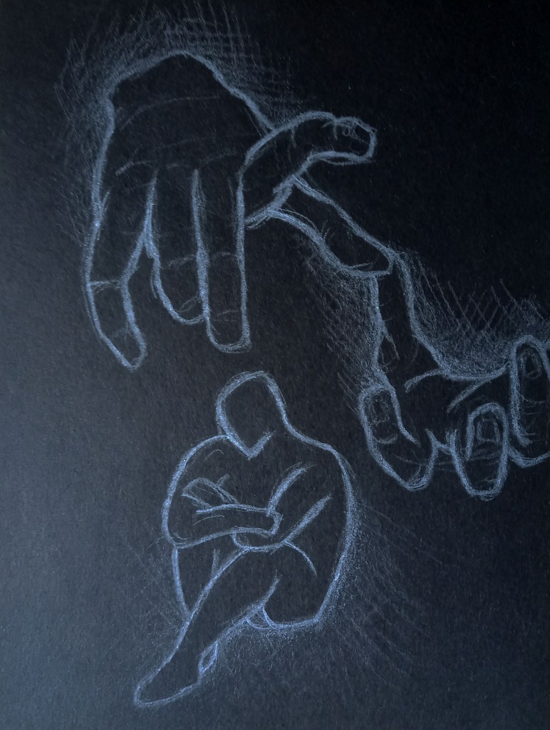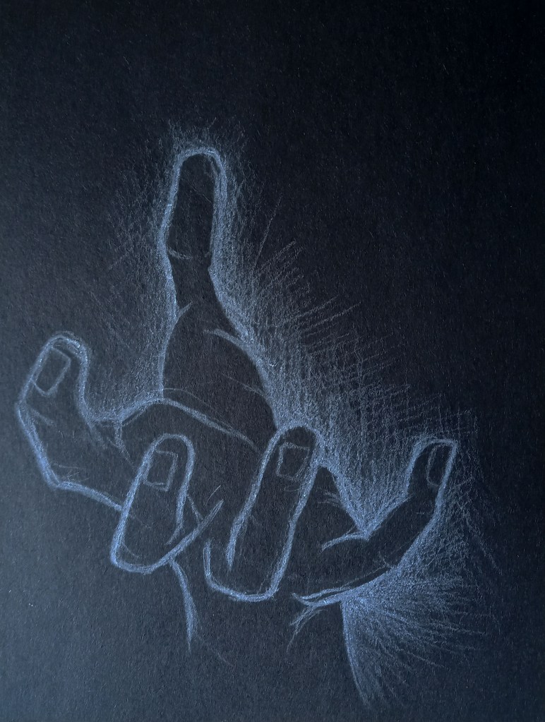 Here is my final image for this brief. I used white pencil on black paper. The light source is above the hands so they are much more detailed that the figure which is much more subtle. I wanted the figure to be less detailed to create the ominous atmosphere felt in the text. As mentioned above I tested different lighting but I think they actually take away from the piece so this is my favourite.