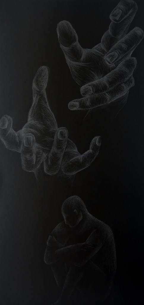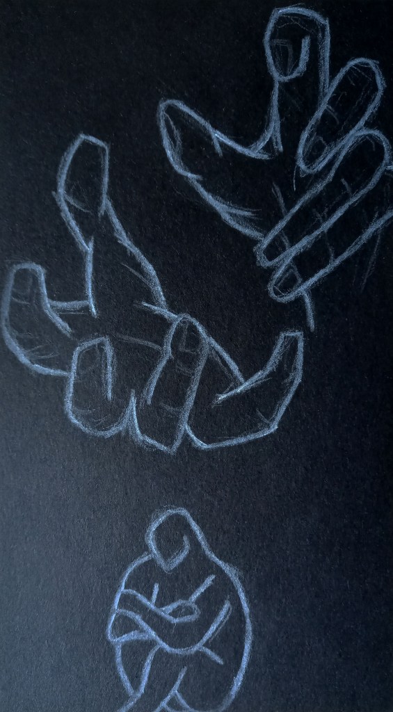 Hands are something that I’ve struggled with before I wanted to include them to try help me improve. I tested out a few different positions, I wanted them all to be reaching out to give the impression that they’re trying to reach the figure. This is a way of representing the theme of shadows that are mentioned in the text.