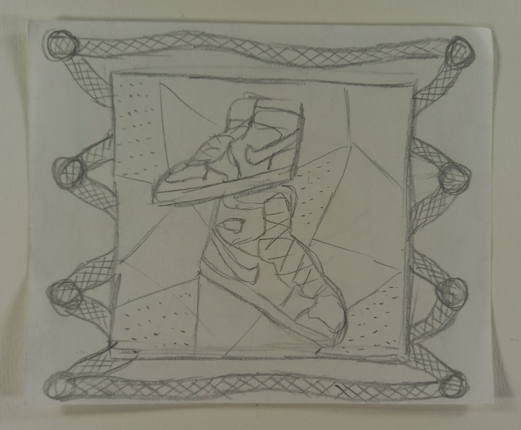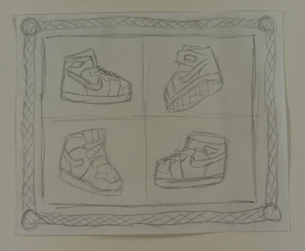 After doing some sketches, this is the composition I decided to go with. I like the lace border as I think it fits the theme well. Also I think the images divided into 4 are very striking because of the range of colour you can get. For the shoes I chose 4 different angles all pointing to the middle. I wanted the silhouette with minimal details, enough to get the idea of what shoe it is but not too much as to not overcrowd the composition.