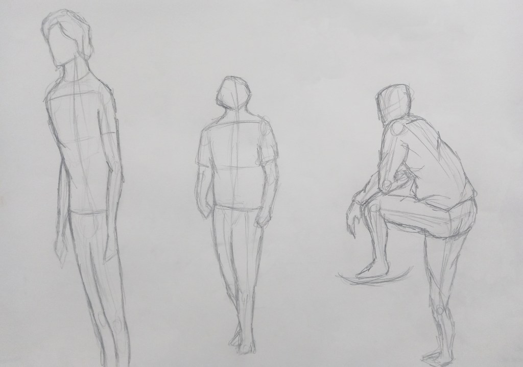 For the figure drawing we each took it in turns to model. Every sketch was done in under 4 minutes, forcing us to work quickly and record only the essential information. Initially we where given no instructions but later on we where told to focus on particular numbers of figures and sketch the scaffolding/framework first which helped to get the proportions of the body. Another technique that helped was putting 1 mark at the top and another at the bottom to keep the whole figure inside to make sure it stayed on the page.