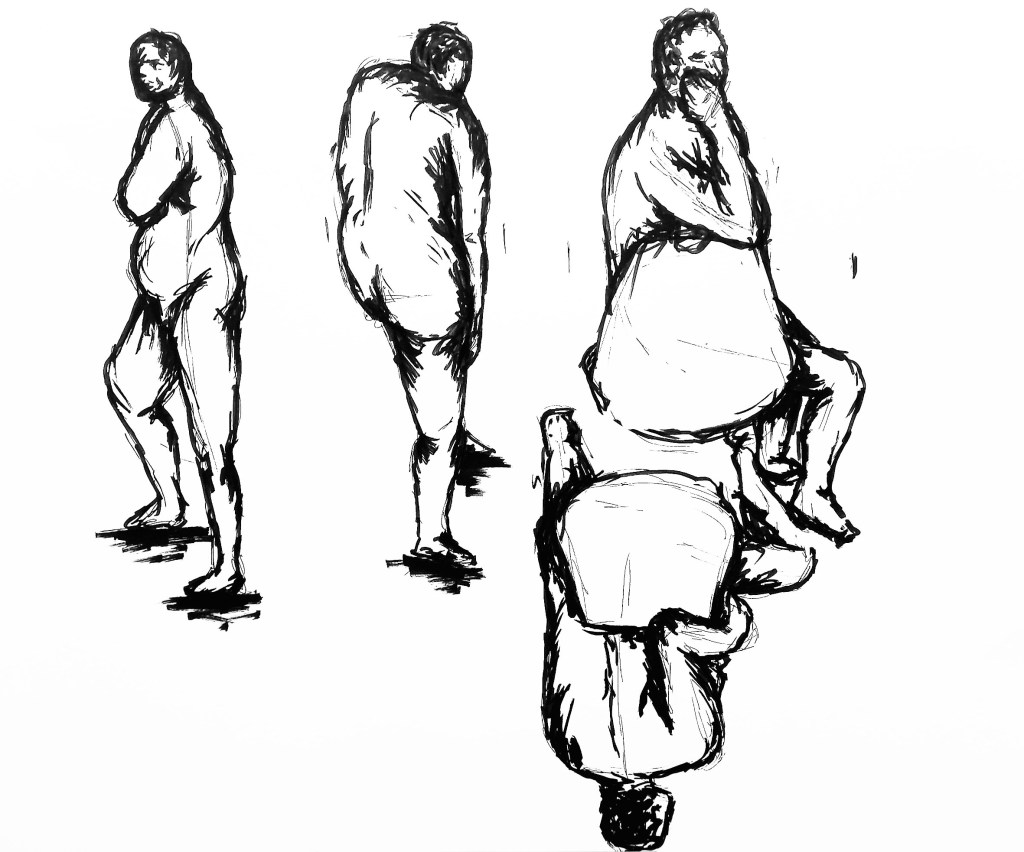 The first exercise we did was a series of 9 1 minute sketches of the model in different poses. For this we used a thin black pen. It was a good warm up to get us sketching quickly and getting used to the models physique.