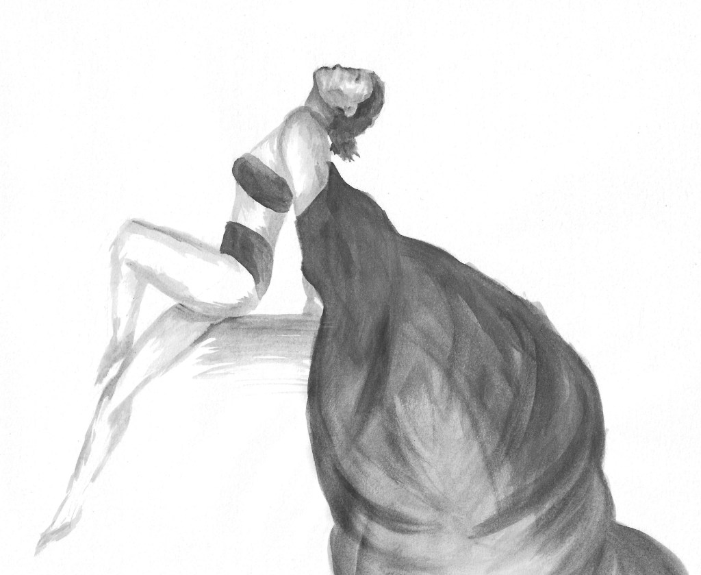 This was my favourite piece I produced in the session. The model stayed in one pose and we had 5 minutes to make a sketch and move location and draw again. We did this 4 times and I created this composition. I find laying down poses more challenging so I was happy to be able to see clear progress. Also I chose to do this is ink and it was the medium I was confident with and wanted to push myself to expand the mediums I can use.