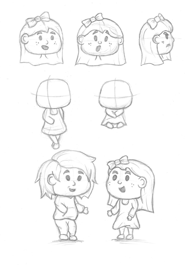 I then made another character sheet for my older sister (Eloise). I aimed to keep the shapes of the body and face consistent to both characters. At the bottom of the page is a full sketch of the 2 characters I’ve worked on so far.