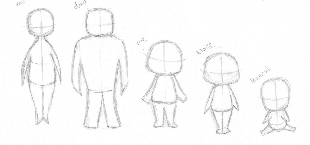 So for this story there are 5 characters I will need to design, Me, Eloise, baby Hannah and my parents. Designing these was the focus of the afternoon session.