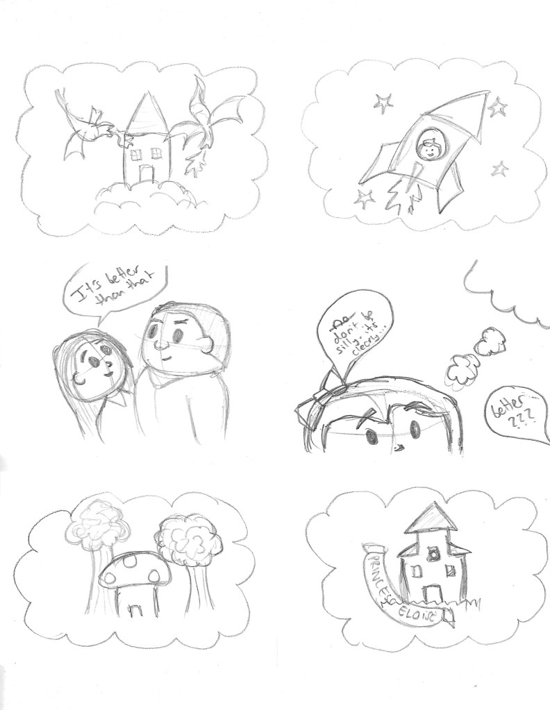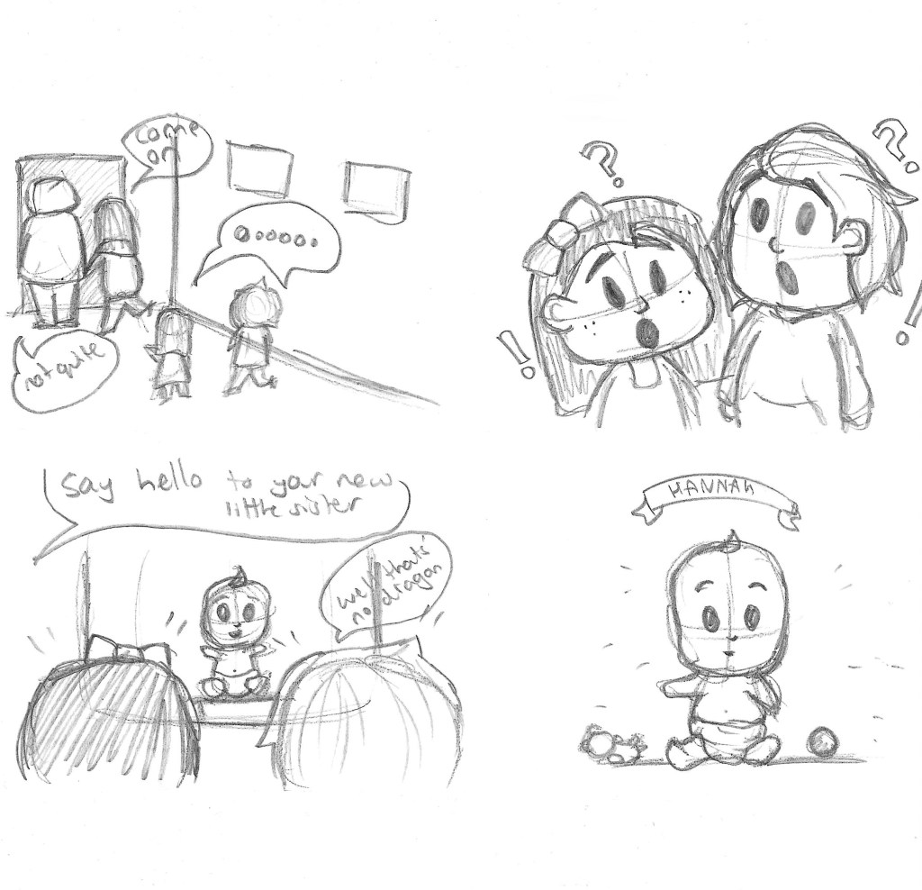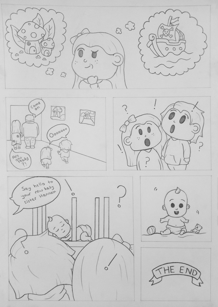 After creating the thumbnails I made the layout for the comic strip. My story is not a complex story it’s just a short wholesome story so I wanted to keep it within 2 pages. Some boxes are bigger than other others demoing of the importance of the frame. The frames where me and my sister are imaging what the surprise could be are large to give me space to show the vivid childish imaginations.