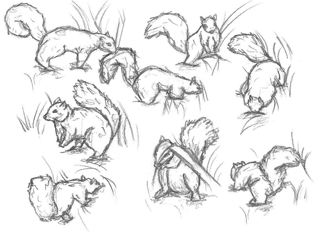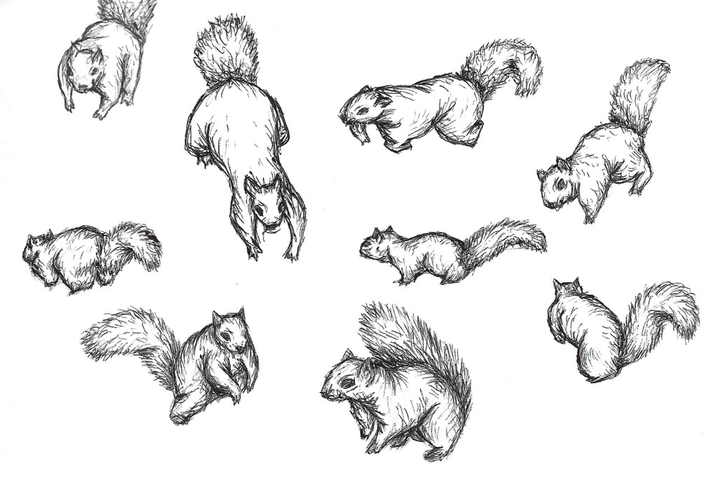 I did a study of a few different squirrels. I was lucky to get close enough to film a few and make sketches of their movements. I tired this in a few different materials, pencil, biro and marker pen.
