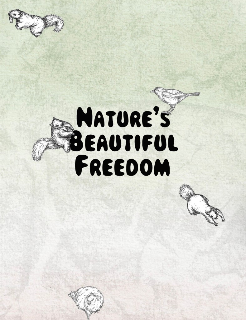 Once I had settled upon the image layout for the main pages I began to work on the front and back cover. I tried out different fonts and eventually chose this one. I liked the fun and bubbly look of it and thought it reflects the tone of my project well. I chose the title ‘Nature’s Beautiful Freedom’ earlier in the project. I used Photoshop to select the text, remove the background and save it as a PNG so when I went to place it in InDesign it would just be the words.