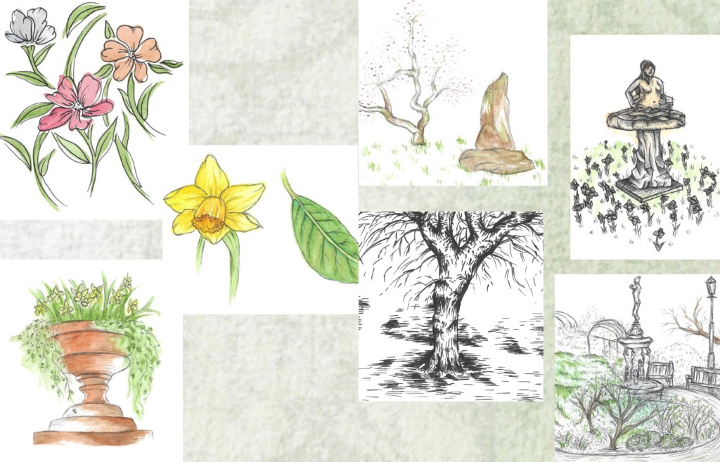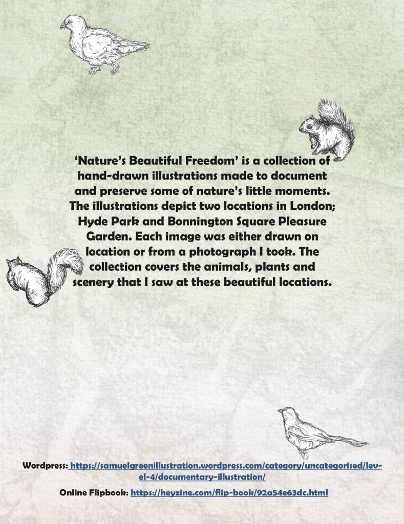 I fixed these problems by using the textured background as just a border and placing the images on a white rectangle. This helped draw the viewers attention straight to the illustrations rather than the green spaces. Also I spaced out the images better. I still kept them in themes, animals, plants and scenery. I chose to put some of the images that I felt where the strongest on their own page. This helps to slow down the experience of looking through the art book and make each image clearer.