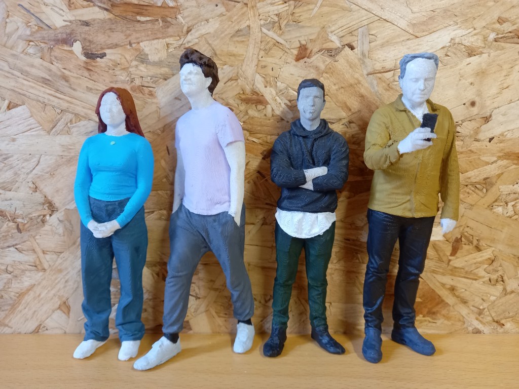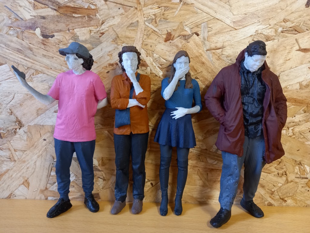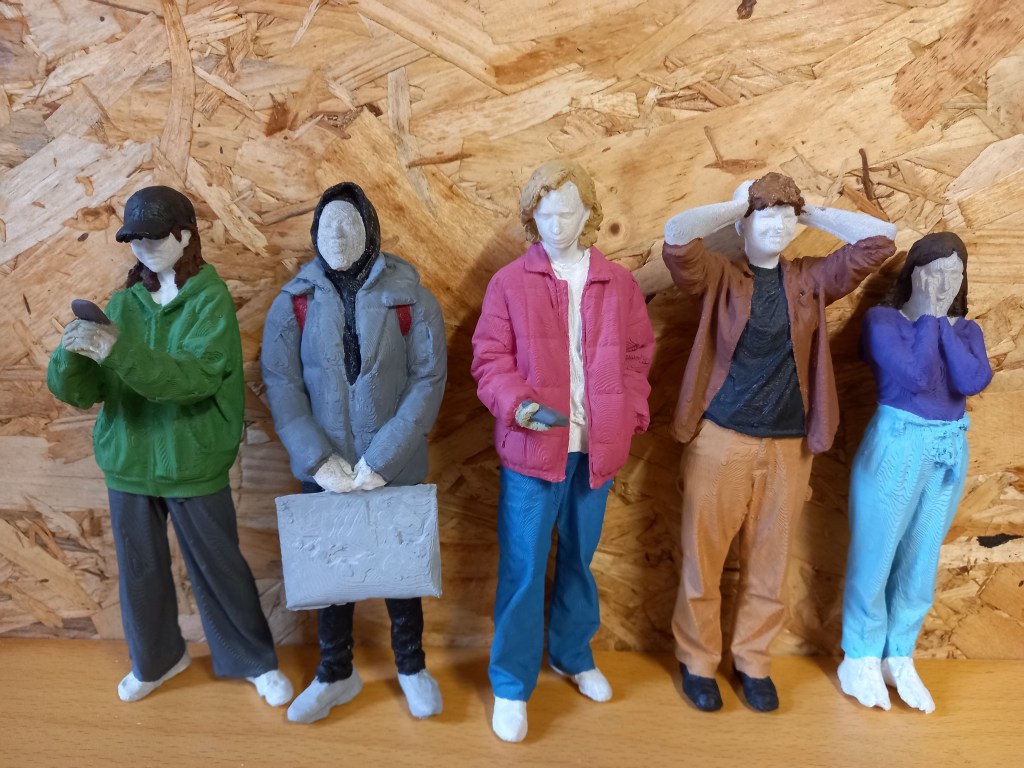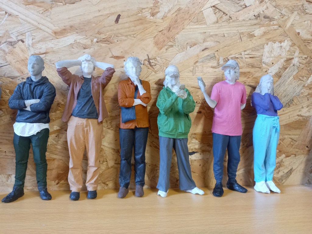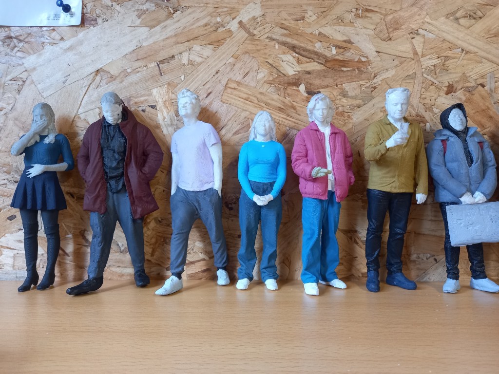 After the outfits I did the hair and accessories like caps and phones. There wasn’t a huge variety of hair colours, mostly shades of brown so I altered some but not drastically. I started with the darkest hair and moved to the lightest. I did each hair with slight colour variations. Giving it a bit more of a realistic look with some lighter and darker bits. With some of the longer hair I accidentally painted over bits of the clothing so it became very helpful that I had been saving the paint from the clothes. For the hair I mostly used thin brushes as there was lots of small gaps that were hard to fill. The hair took about 10 hair to do.