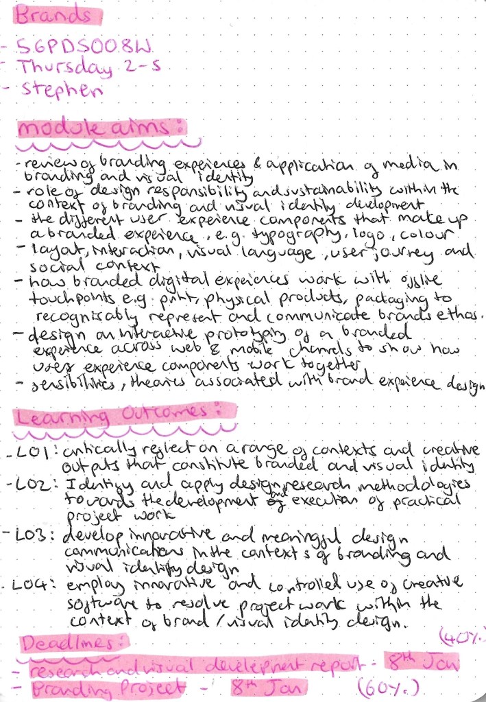 In our first Brands session we went through the Module handbook and I made notes about the deadlines, assessment criteria and assessment deliverable