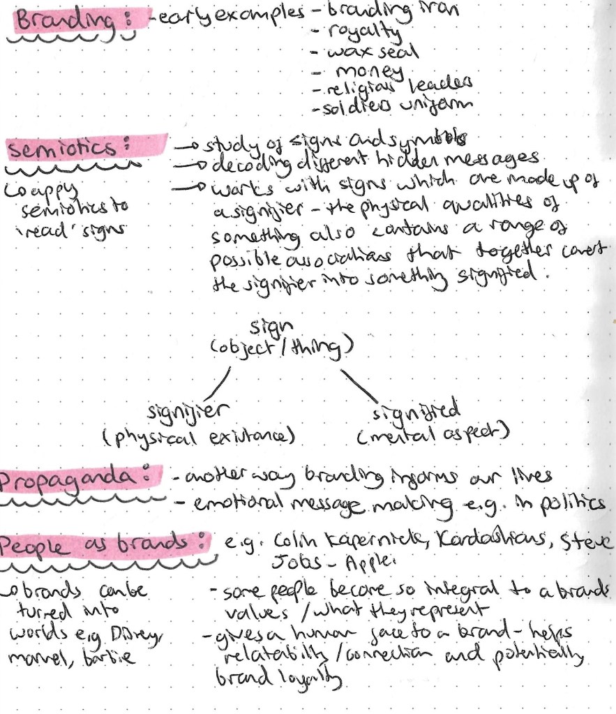 We had an introductory lecture where we discussed the basic topics such as what makes a brand, the meanings of branding, marketing and advertising and semiotics. A brand is a combination of visual communication representations. Some elements that makes up a brand are a name, logo, colour palette, typefaces, language, slogan, aesthetic tone and consistency. I made notes and research some bits further. I found it all very interesting as it’s all relatable in day to day life as we’re constantly exposed to brands and their marketing/ advertising. Even just from this session it’s made me more aware and conscious of the way brands work.