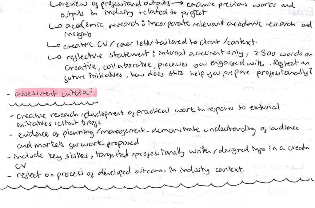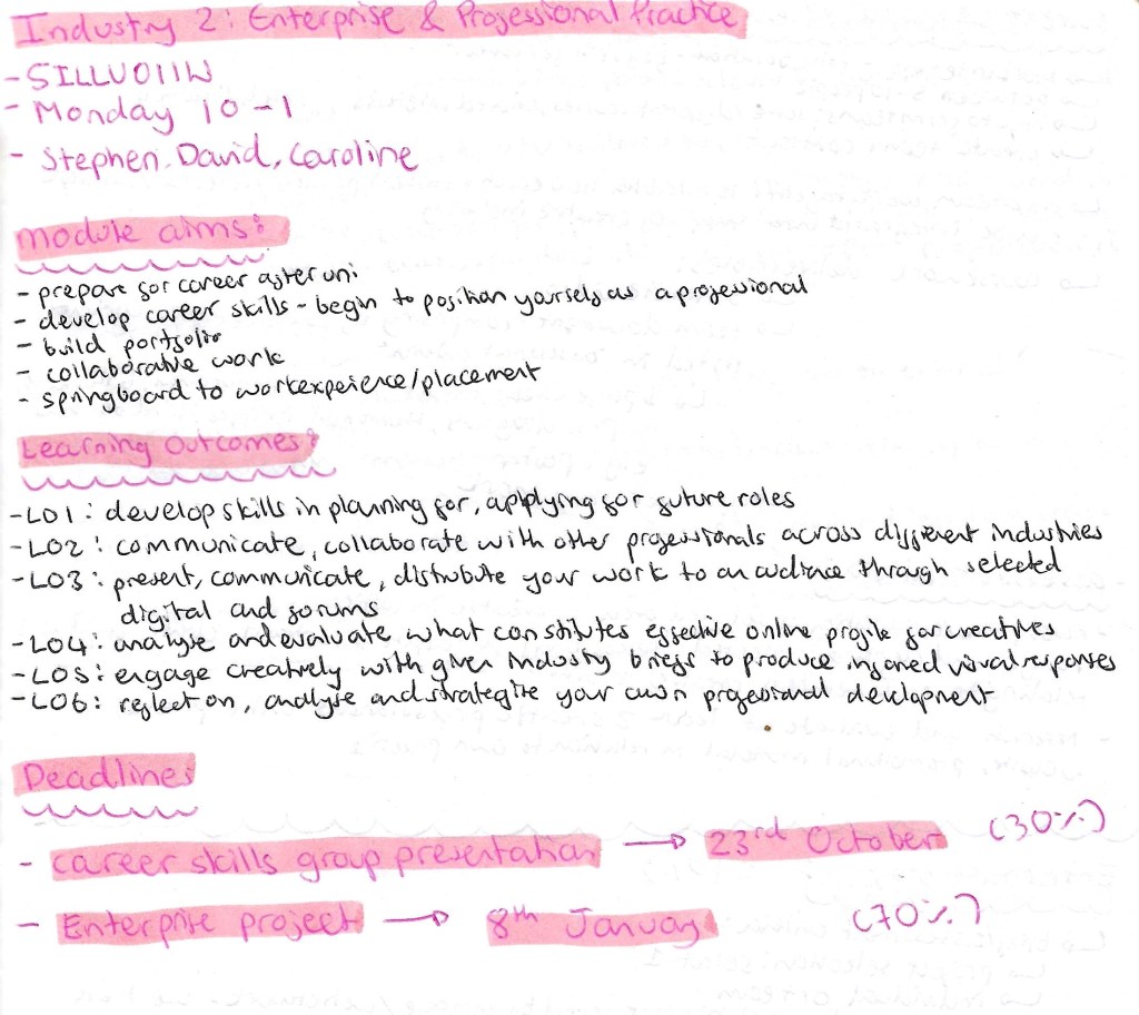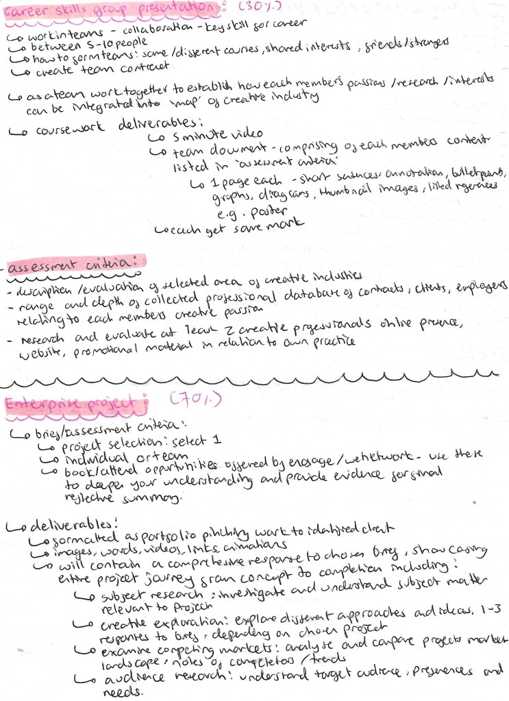 In our first session we went though the Module handbook and I made notes about the deadlines, assessment criteria’s and assessment deliverables.