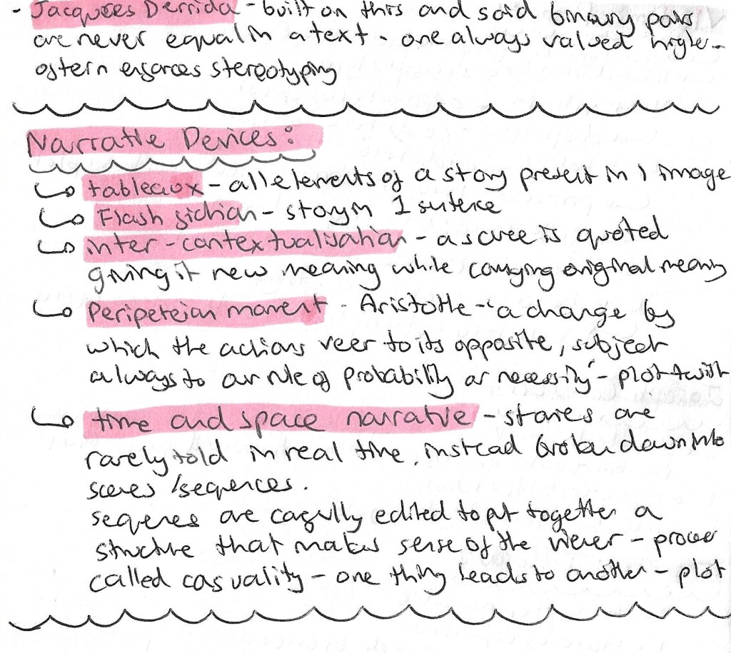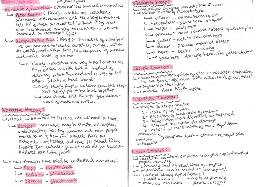 We had a lecture where we went through some of the basics of narrative theory and narrative devices. As well as some key individuals and their ideas of narratives. I made notes from this and plan to research some of these points further. I particularly found Propp’s idea of the 8 character roles interesting as I could see each of these roles in a lot of the movies and books that I like.