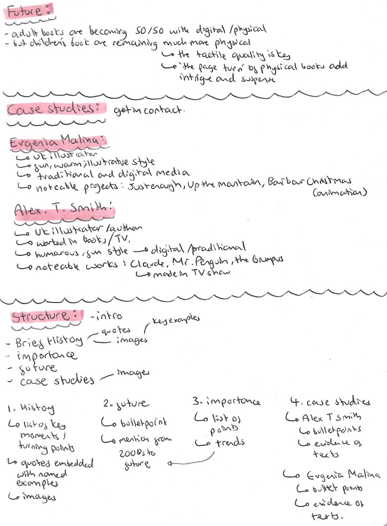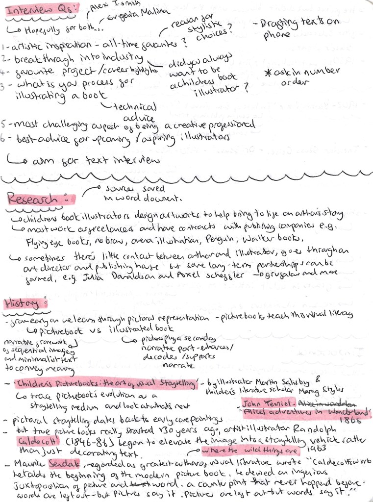 The 2 case studies I want to include are about Alex T. Smith and Evgenia Malina. These are both illustrators whose style and work I admire. I will include some information about them both and hopefully be able to contact them. I will try reach out to them on Instagram. I’ve planned some potential interview questions for them that I hope I’ll get to ask and include in the video.