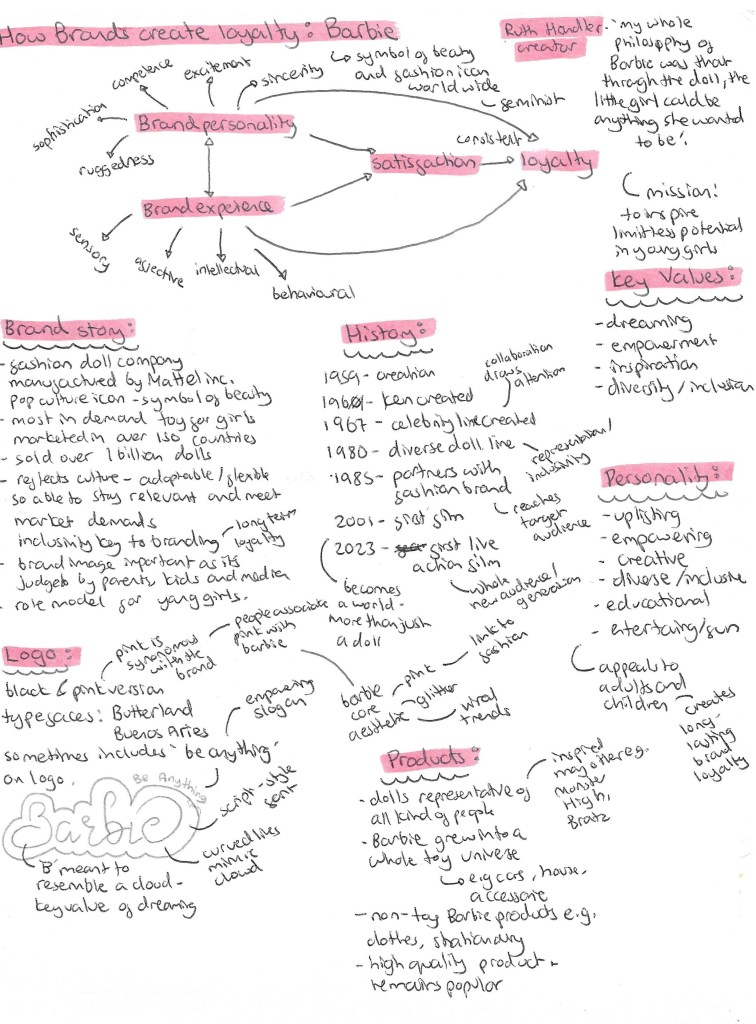 Our research task for the week was to choose from a selection of brands and research them and how they’re able to create brand loyalty and trust. I chose to look into the Barbie brand. The general map for how a brand creates loyalty is through the brand personality combined with the experience which creates consistent satisfaction and then loyalty. I enjoyed this research and in particular learning how engrained inclusivity and diversity is in the brand values. Some believe this is a newer addition to the brand ethos but it was actually there from the start. This is a key reason as to why Barbie is able to create loyalty as people see themselves and their values reflected in the brand.