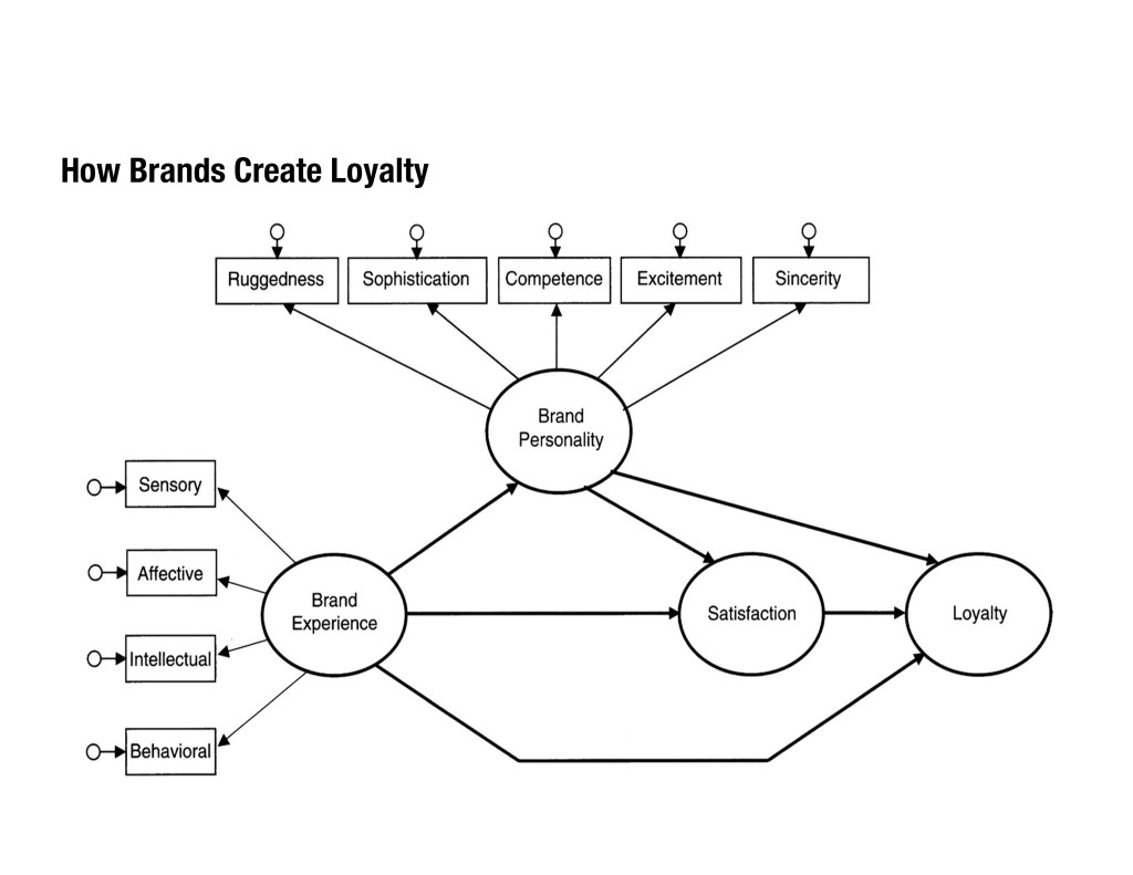 This model breaks down the idea of creating brand loyalty into 2 sections, brand personality and brand experience. Each of these are broken down into sub sections. When a customer likes the brand personality and is happy with the brand experience this leads to satisfaction and with consistency it will create brand loyalty.