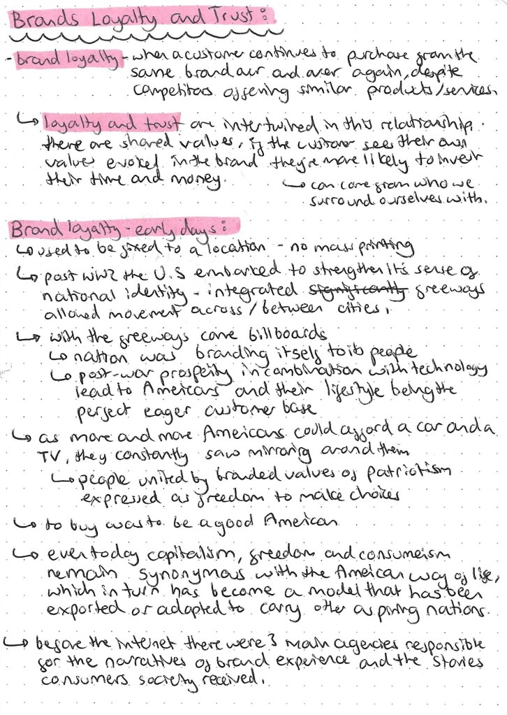 In this weeks session we learnt about brand loyalty and trust. Brand loyalty is when a customer repeatedly purchases from the same brand despite competitors offering similar products and services. A customer could feel trust in a brand due to shared values, if you see your own values reflected in the brand then you’re more likely to invest your time and money. I found this interesting in connection to my brand research from last week as I have brand loyalty for Puma and WWF so it was interesting to see exactly why that may be.