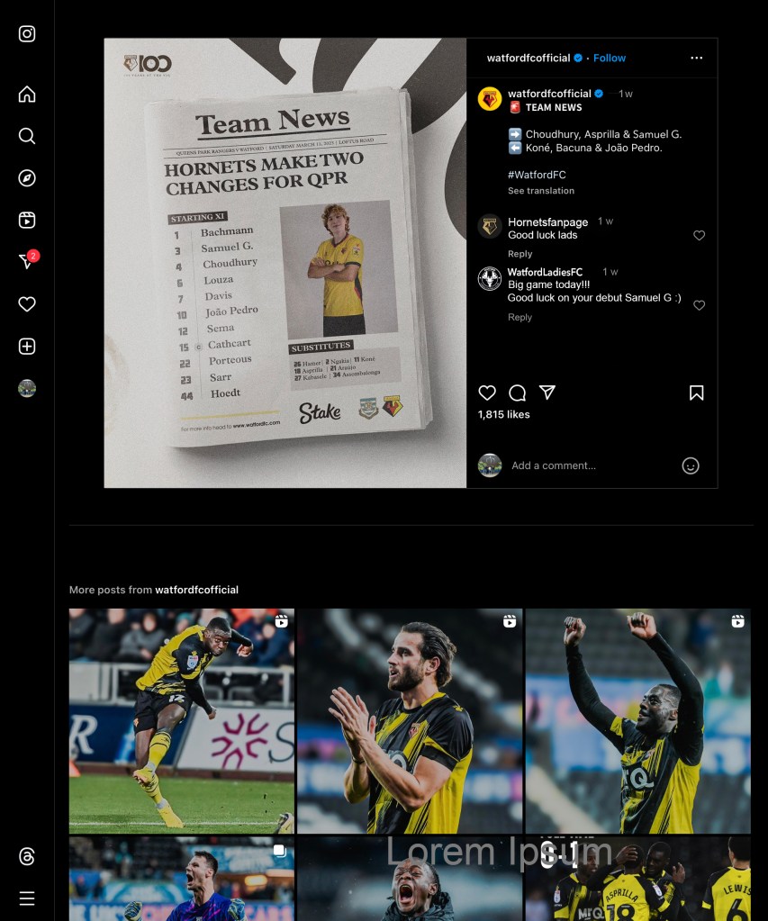 Once I decided on the idea I looked on the Watford FC instagram and saw these team sheets that they post before each game. I thought they looked cool so chose to edit these to be my fake social media posts. I used an image of myself, cut out the head and neck and put in on the player. I spent a while editing the images to try get my head to blend with the body. I also removed one of the players names from the team sheet and put my name on it. I edited the name to try get the same colour, size and font. I found it difficult to try and make it convincing so did 2 for practice. I will continue to try advance my skills on Photoshop but am happy with my progress.