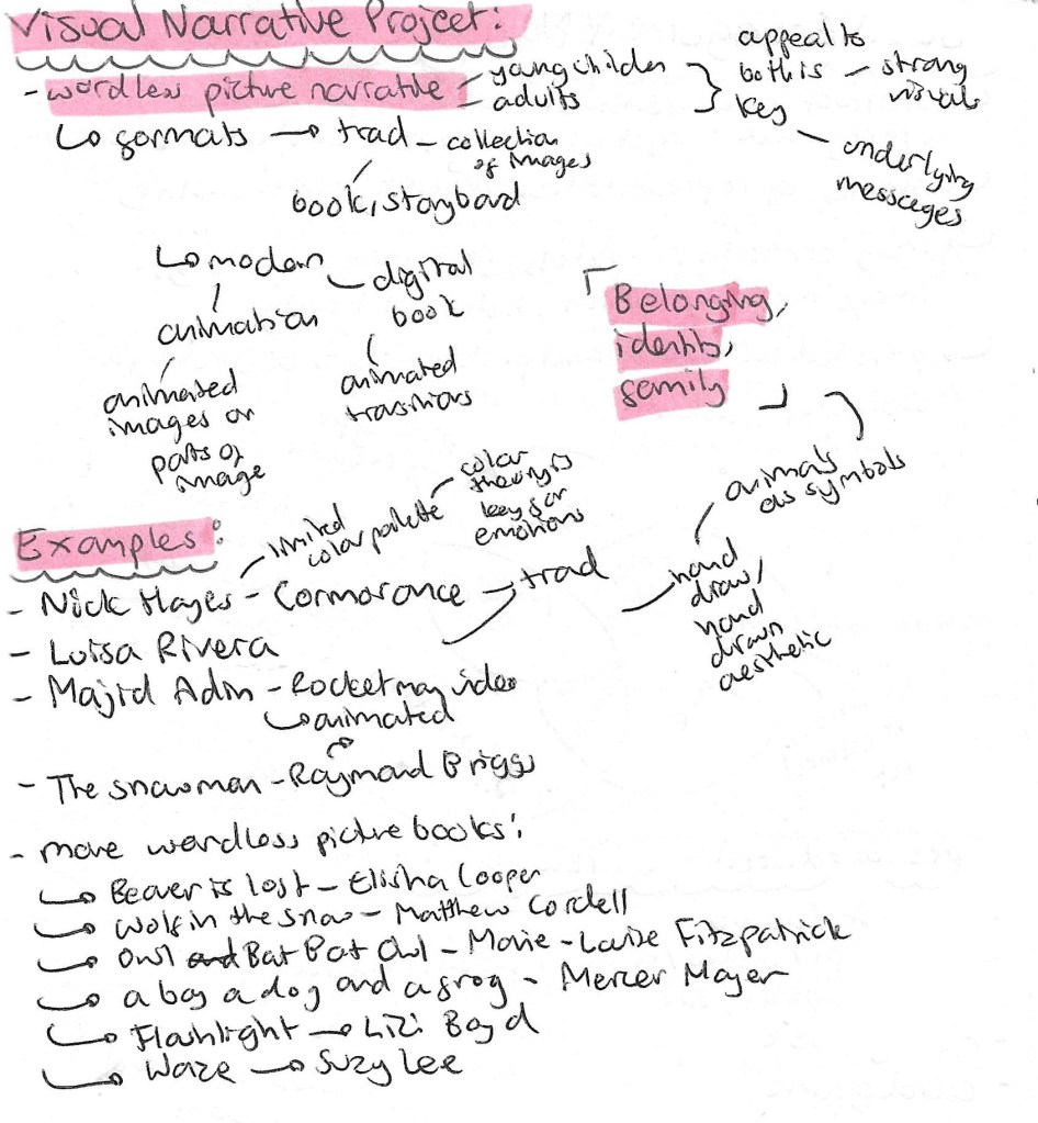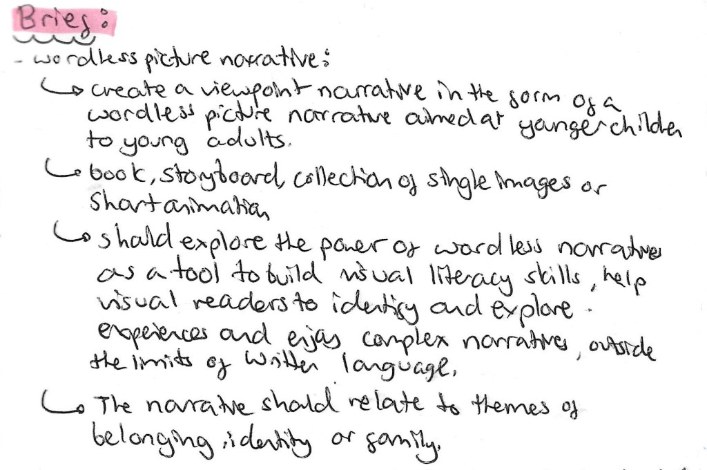 The third potential brief we where introduced to was about creating a wordless picture narrative, this is a narrative that is entirely expressed through illustrations. In summary it is to create a viewpoint narrative in the form of a wordless picture narrative exploring the themes of identity, belonging and family. From the beginning of this module I’ve had a stronger interest in this brief compared to the other as it’s more something I general enjoying creating and engaging with. Below is the criteria for this brief.