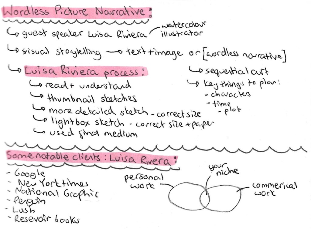 For the session we had Luisa Rivera come in to speak to us about the topic of wordless picture narratives and her work. She is a London-based artist originally from Chile, working primarily on paper with water-based media, exploring our relationship with the environment through multiple layers of interpretation. She draws on storytelling to create narratives that are inhabited predominantly by women and natural elements, covering themes such as ecology, feminism, and personal memory.