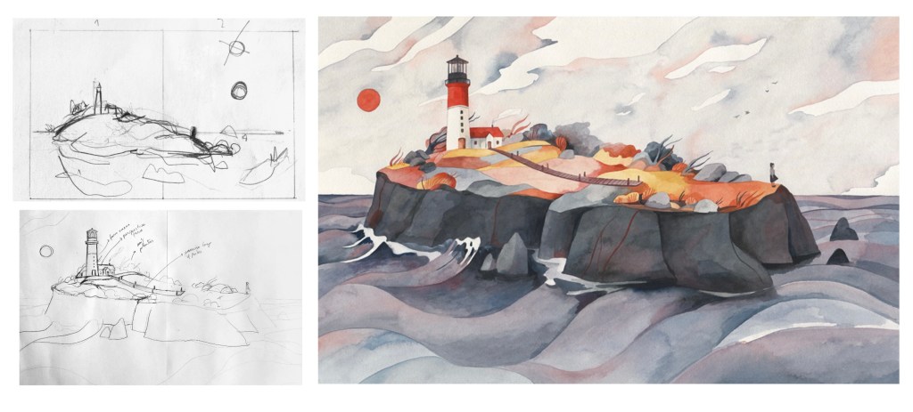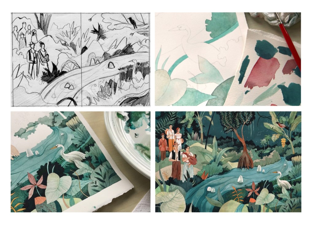 Luisa Rivera also took us through her creative process from when she is applying to get the work from the client to its final submission. The images below show the progress from a rough thumbnail sketch to the final outcome. She starts with a thumbnail sketch for ideas then moves onto slightly more detailed sketches, mapping out placement. Then she tests out colour and finally uses a light box to transfer the sketch onto the right type of paper and starts using her medium of choice, usually water colour.