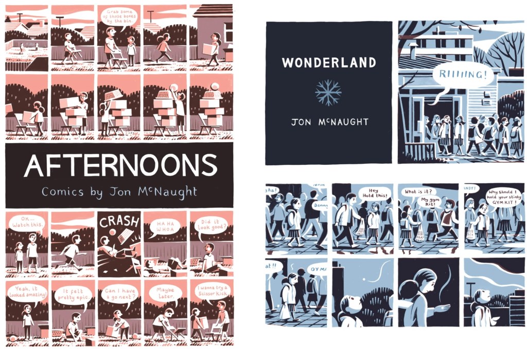 John Mcnaught has a similar visual style for his wordless narratives, very minimal colour palette and cartoonish characters. I think for wordless narratives, reducing the colour palette to 1 or 2 colours with lots of variation is shades is very effective as it easily translates mood and emotion to the visual reader.