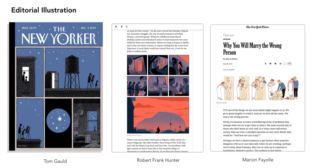 These are some examples of wordless narratives in other forms, editorial illustration and animatics. I will look into these as they will all be helpful in enriching my knowledge of wordless picture narratives so I’m able to construct my own.