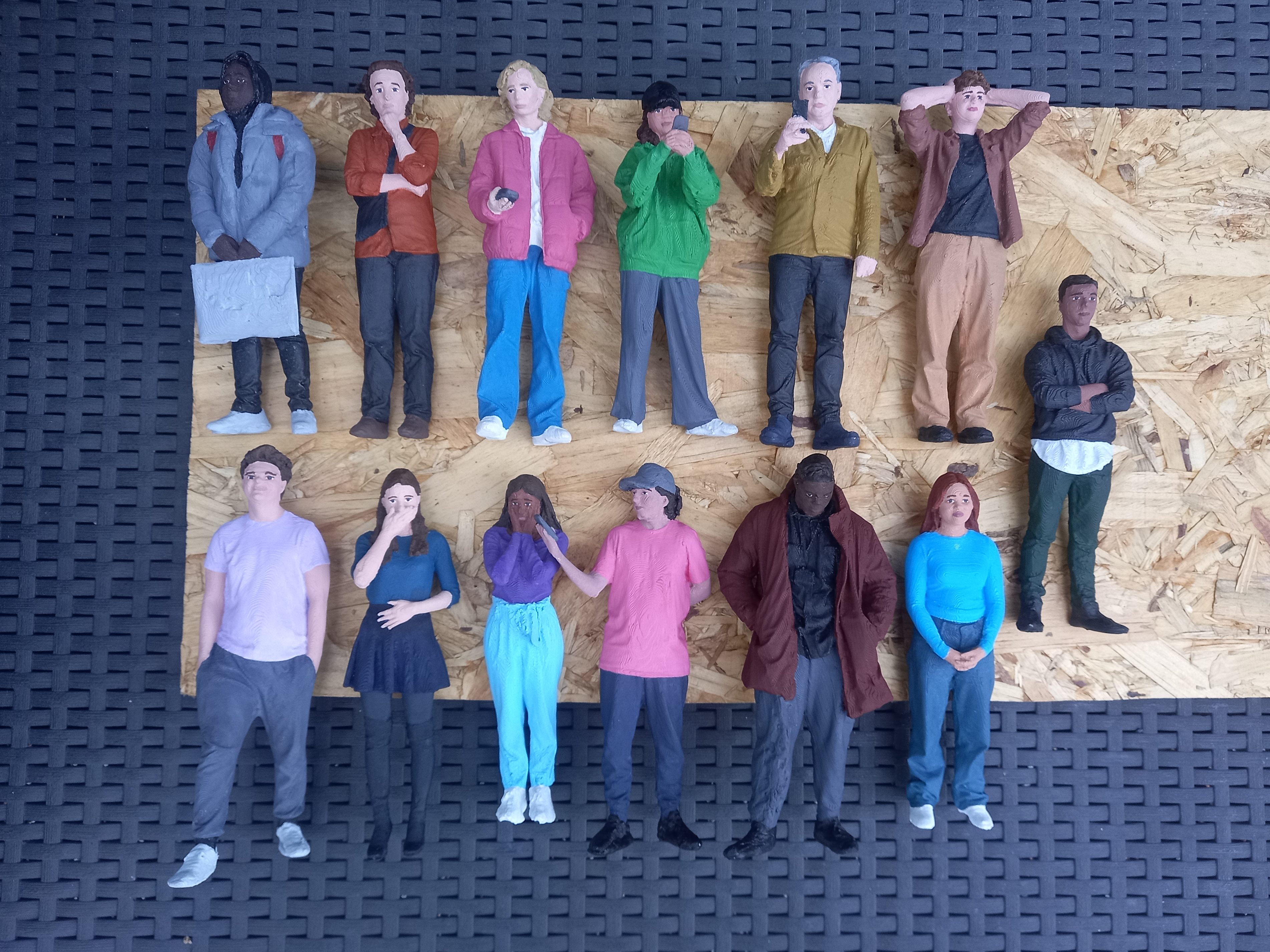 The main areas of interest in this project for me are making the figures, building the set/exhibits and post production such as lighting and arrangement. At this point in time there is a laser cut flat pack of the overall shape of the Hall, which is 3 meters long when built. There are also 15 completed figures which I worked on during the summer. They are wearing bright coloured modern clothing as we wanted the model to be as if modern day people had gone back in time and visited the Hall. This is a way of making the model more interesting and relatable to the audience. Also it will contrast the muted colours around the Hall to make the model more visually engaging. These are the figures I completed during the summer ( see blog roll titled ‘3D models summer work’ for detail on this process.)