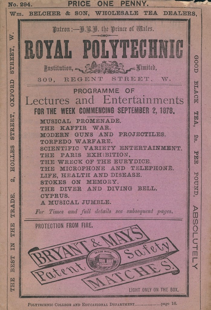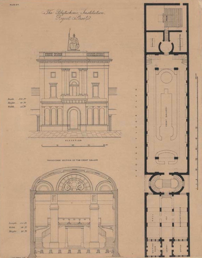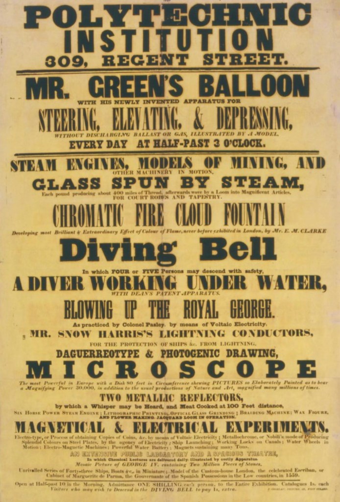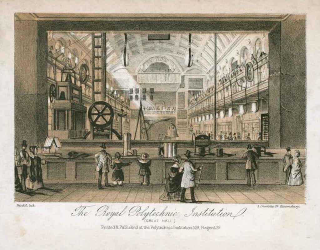 The Polytechnic Institution was opened in August 1838 to provide the public with a practical knowledge of the arts and sciences. The institution opened in 1839. Public attractions included exhibitions, working machines and models, scientific lectures, rides in a diving bell and demonstrations of photography. John Henry Pepper was its most famous showman, someone who we want to recreate for this model.