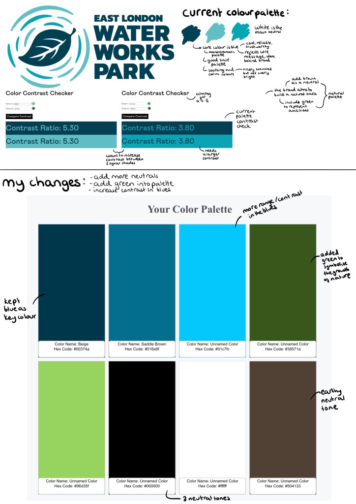 This is my work on adjusting the colour palette for the branding. The key alterations I made were increasing the variation between the 3 shades of blue, adding some green into the palette and adding brown as an additional natural neutral tone. I will keep white as the primary neutral tone as it brightens up the page as helps keep a calm feel to the brands image.