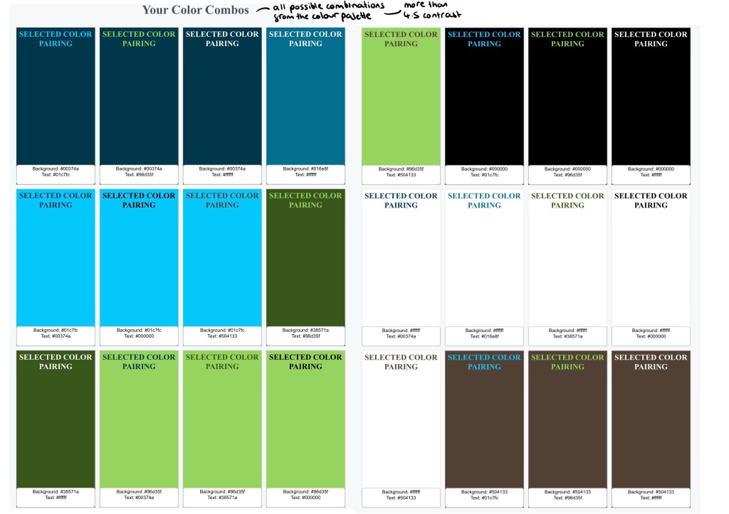 This show all the different compliant pairings of colours, highlights the diverse typography opportunities with the new colour palette.