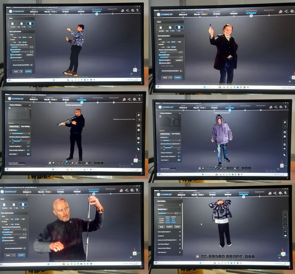 There were a few times that we had to repeat scans as they didn’t come out well. This was either due to the subject moving too much or the person scanning not capturing all the areas well enough. These are some of the scans we did during the session. We were able to scan Professor Pepper, 2 general visitors, and a 5 person Orchestra with a conductor, violin player, bass drummer, flutist and cello player. We picked instruments and poses that were authentic to the time period. For the instrument we used place holder such as metal poles and screw drivers so that the people being scanned could pose as if they where actually holding it. Once they’re 3D printed we will hand model the instruments. In the same way I did before I’ll hand fill any gaps or remodel any bits that don’t print well.