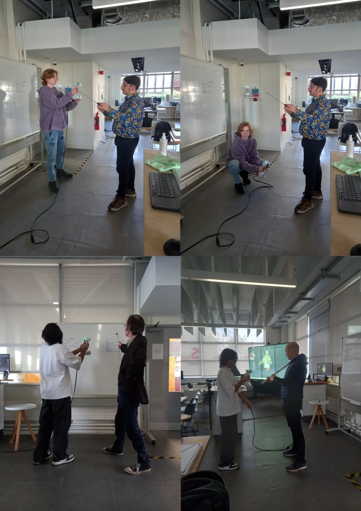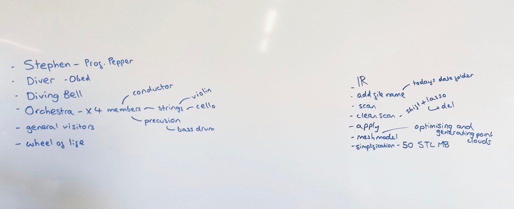 On the right of the board are notes I made to help us use the 3D scanning software Shining 3D. This is an industry standard software as it’s one of the most reliable and highest quality 3D scanners. We used Eiscan sensors which are handheld devices that someone holds and moves around the person being scanned. 3D scanning works by a sensor sending out light which gets reflected off a surface and goes back into the sensor. The time this takes indicates how far away the subject is so the software os able to construct a model using this information.