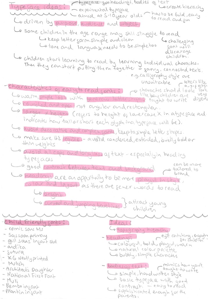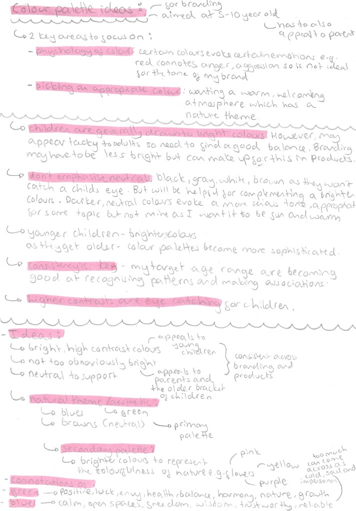 This is the final colour palette I chose for the branding. I did lots of research into how to tailor a colour palette to children. I will keep the palette consists across all platforms and products as children respond well to consistency as they’re good at recognising patterns. The key pieces of advice where that children are generally drawn to bright colours but make them not too bright as they could come across at tacky to the parents and don’t emphasise neutral colours. I went through lots of variations before I chose this palette. For the neutrals I wanted black and white as they go well in every palette. I would primarily use white more for backgrounds as it lightens up the page and black for the writing as it’s easily readable, making it child friendly. Green and blue as they’re commonly associated with nature so would translate this message well to children. I chose a couple different shades of each. These are cool colours so I wanted to contrast these with some warmer colours, these being orange, yellow and pink. These are eye catching and pair well with the cooler shades.
