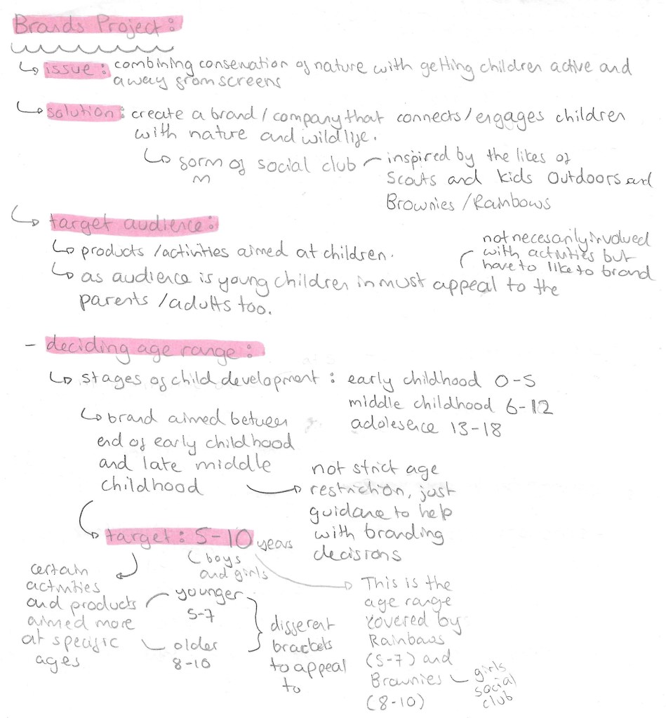 Before making any branding decisions it’s important to research and figure out exactly what topic you want to tackle. The main thing I needed to figure out more specifically was who I wanted my target audience to be. My campaign will be a type of social club, inspired by the Scouts and Brownies, to engage children with the natural world. I looked into the different stages of child development to get a better understand of what age group I wanted to target. I decided to aim my campaign at children aged 5-10. This is not a strict rule as anyone would be welcome but more of a guideline to help me create the branding and campaign. 5-10 covers the end of early childhood to the middle of middle childhood. Some activities and product may be more target to the younger or older end of this bracket but everything will be suitable for all.