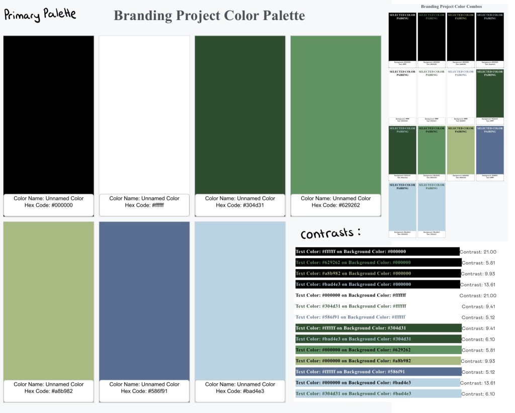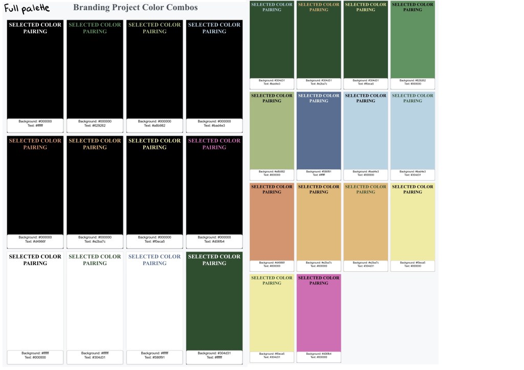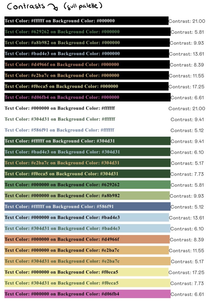I put the palette into a software that checks the contrast between colours. A score of 4.5 and above is the target for a good pairing. These are all the colour pairing with above a 4.5 contrast. The colour palette gives me a wide range of compatible colours to use.