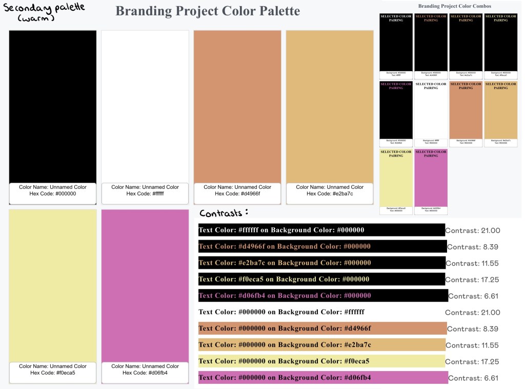 The primary palette will be complimented with accents of the warmer secondary palette. This image shows the colours, compatible pairings and contrasts within the secondary palette: