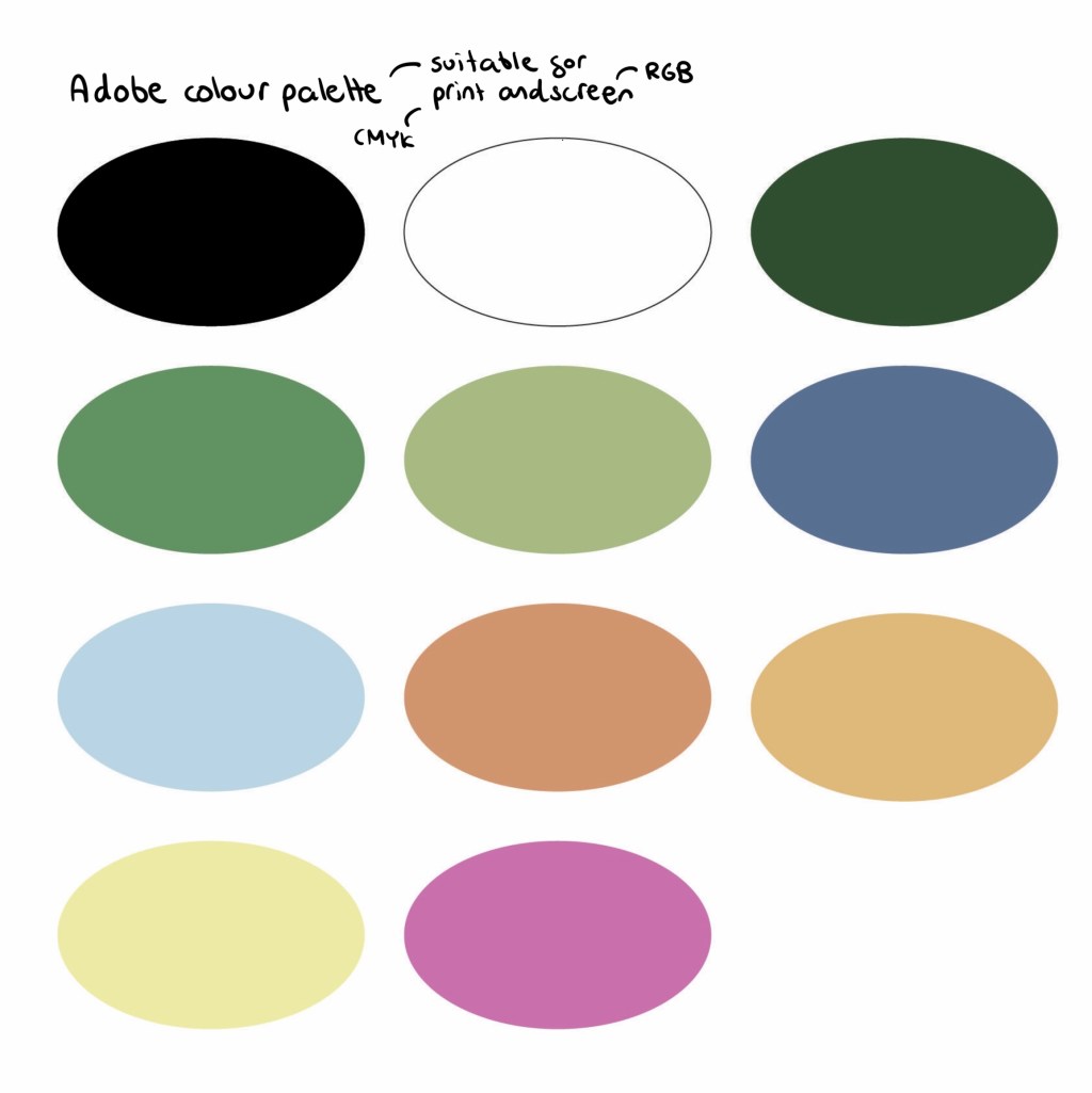 I took this palette and added it into Adobe Illustrator and Photoshop. I chose colours that aren’t too bright so they’re easy on the eyes and are compatible in both CMYK and RGB colour modes. This means I can use the same palette across print and digital media.