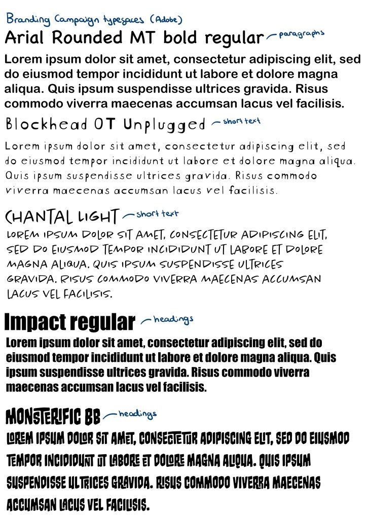 A good set of typefaces for a brand needs at least a typeface for bodies of text, a typefaces for heading and a more decorative typeface. Deciding on good typefaces was important as it needs to be appealing to both parents and children as well as legible to accommodate for children with different levels of reading ability. I looked in the Adobe font stock as I wanted all the fonts I chose to be easily available across Photoshop, Illustrator and InDesign as there are the software I plan to create most of my products. For the paragraphs I chose Arial Rounded MT bold regular. This is a simple typeface with nice rounded edges that give it a friendly appeal. It also maintains a professional look that is aimed at the parents because these larger bodies of text with be information for them. For the shorter bodies of text I’ll use a combination of Blockhead OT Unplugged and Chantal Light. They’re more dynamic and fun with nice simple letter forms that are written in the style that I child would learn to write in. The hand written style is perfect for notes and captions. For headings I’ll use Impact Regular and Monsterific BB. Impact is a rigid bold typeface that is perfect for more professional heading. Monstreific is more decorative and fun so is perfect for title and products I want the children to engage with.