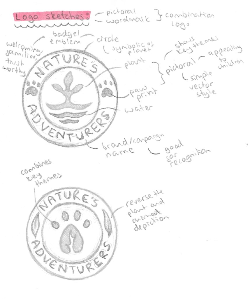 The style of logo I wanted was a combination logo that has an image and the brand name. This is ideal for starting businesses and campaigns as it gets people familiar with the image and the name, improving recognition and in the future 1 element could be removed and leave other. I also wanted it to be en emblem style and resemble a badge so having an image in the middle with the name curved around it. This will then make it perfect for merchandising. Below are a couple sketches I did of ideas with annotations for the reason behind the design choices.