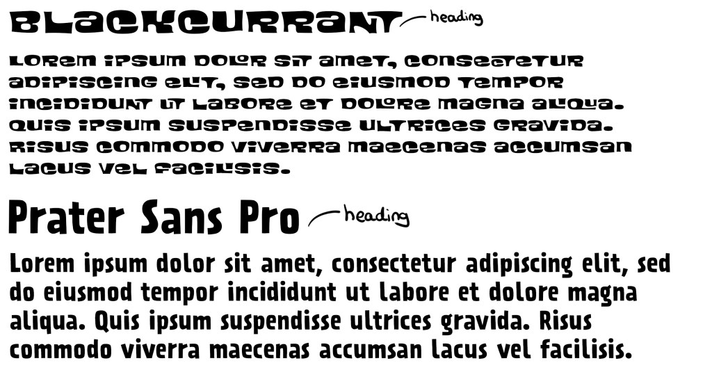 Blackcurrant and Prater Sans Pro are 2 more Adobe fonts I added to my collection of typefaces to use. I had a meeting about my project and got feedback on the typography choices. I was told I needed more heading fonts that reflect the fun and playful theme of my campaign. Impact is too rigid and compact for some headings so I chose a couple other options.