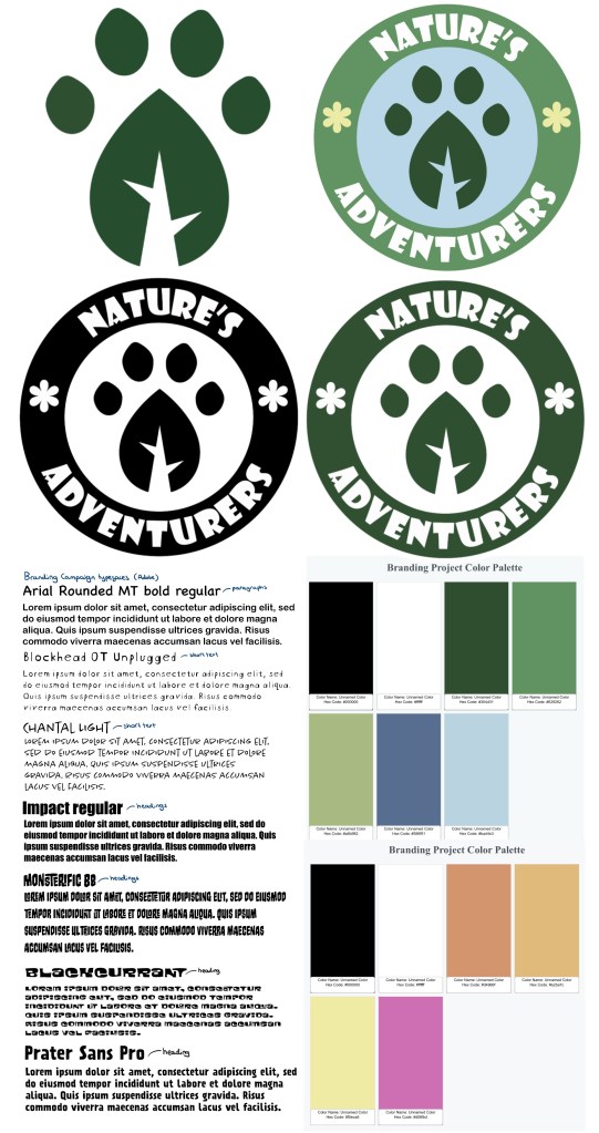 For the name it has to appeal to children as they’re the target audience but also the parents. I went through different versions of the name before I settled on ‘Nature’s Adventurers’. My initial idea was to call the campaign ‘growing with nature’ but with some research I found there was already a company with this name so didn’t want to potentially infringe on any copyright laws. So I then thought of ‘Nature’s Little Adventurers’ but found this too wordy so settled on ‘Nature’s Adventurers’. Also I thought that including ‘little’ in the name may come across as patronising to the older children in my target audience so didn’t want to exclude anyone. The name is short and simple but gets across the key themes of the campaign.