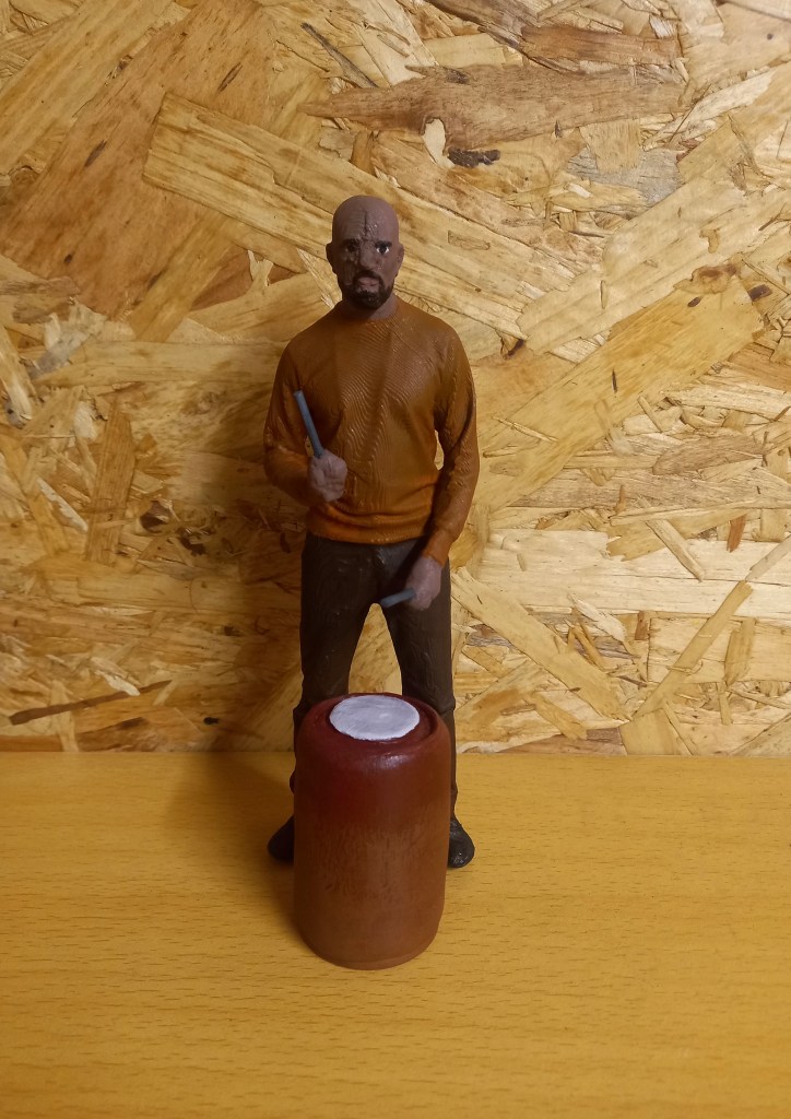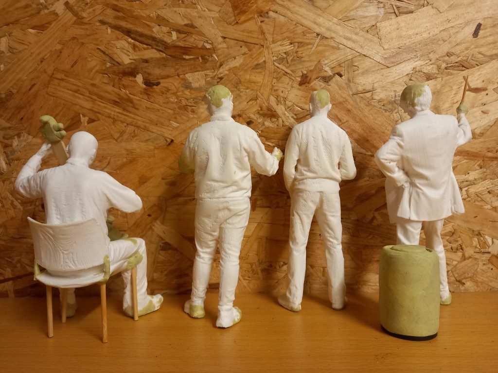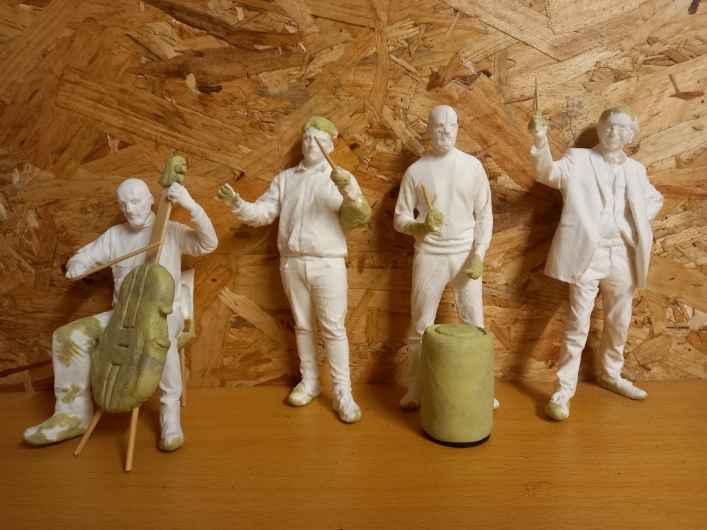 Also, compared to the previous batch I had a lot more modelling and repairing to do. As usual the tops of heads and feet needed work to fill in. All of the prints were holding stuff in their hands. We used props during scanning to recreate this but they were too thin so didn’t print well, meaning I had to remove what was there and create something new. To create the props they’re holding like the drum sticks I used 2 different thicknesses of cocktail sticks which I then attached to the model using a combination on miliput and hot glue. I also created the drum and cello. The drum is made from an empty roll of film which I covered in a smooth layer of miliput and added details to the top. The cello is made from miliput and wooden sticks. I used the sticks to create the shape and neck then built up the details with the miliput. I will add strings made of thin wire at the end, after it’s painted.