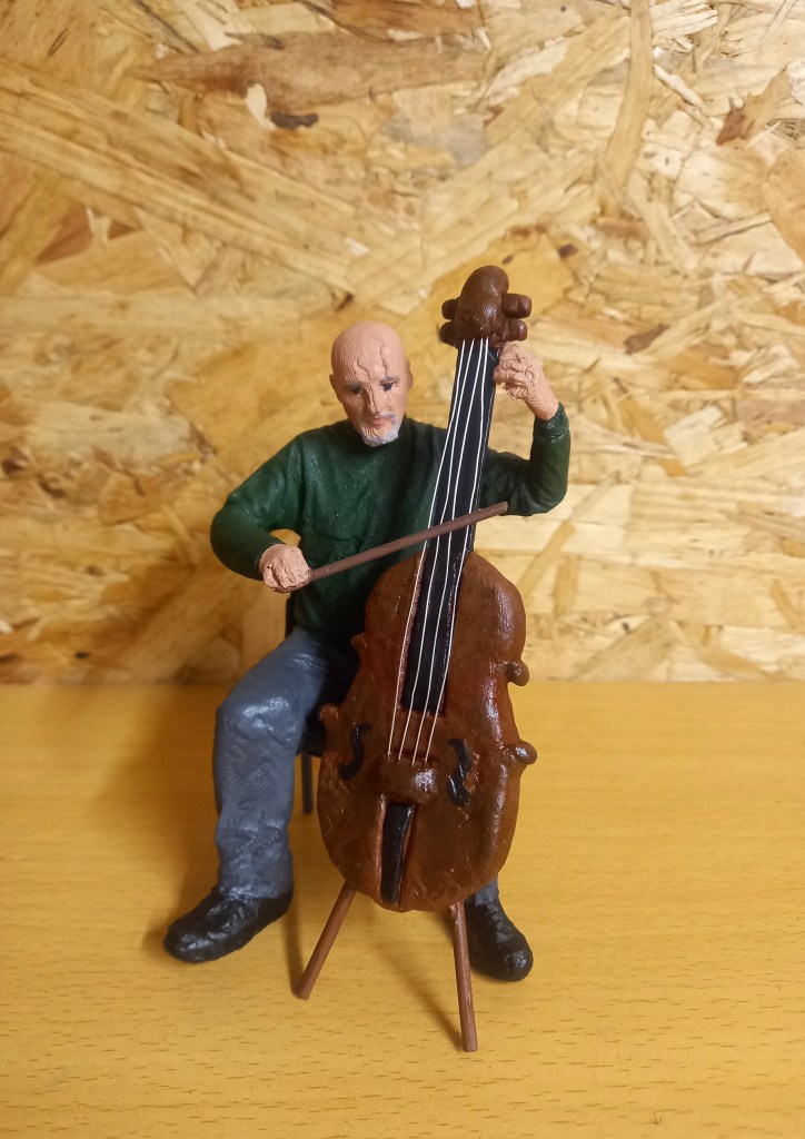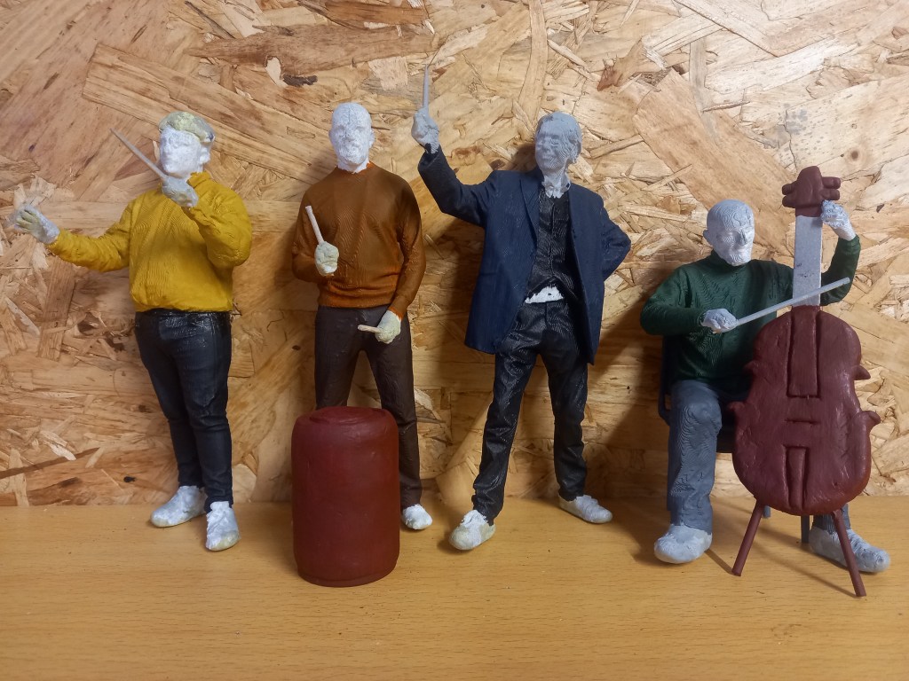 Here are the 4 completed figures and the 2 instruments that go with them. These figures really pushed me as the had more detail and complex poses than the previous batch. I chose to contradict the usual black and white attire of an orchestra by using a more colourful palette while not making them too bright. I did this to make them more visually interesting and it will help draw attention to them when they’re in the model. One particular piece that I’m pleased with is the cello. I think I made the shape well using a combination of wooden sticks to create a scaffolding and built up the details using modelling clay. I then painted it and coated it to give it a nice glossy finishing to imitate the wood used in instruments like the cello. I then added 4 strings using a thin metal wire which I attached using hot glue and miliput to secure and blend it into the body of the cello. Also it fits well in the pose of the figure and is true to scale.