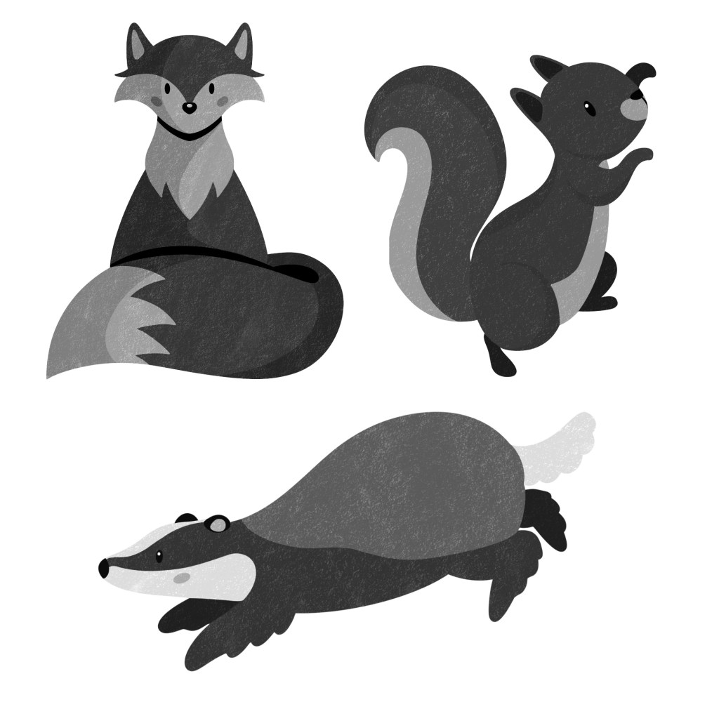 In one of the sessions I had I was given feedback on my designs and told that for some outcomes, in particular merchandise, the characters may be better with less colour. This is because I already have lots of strong colours in the brand palette so to actually make the characters stand out I need to remove the colour. I experimented with different ways to do this. First I tried just desaturating the colours but I didn’t like this as they seemed too lifeless and I thought the details didn’t translate well.
