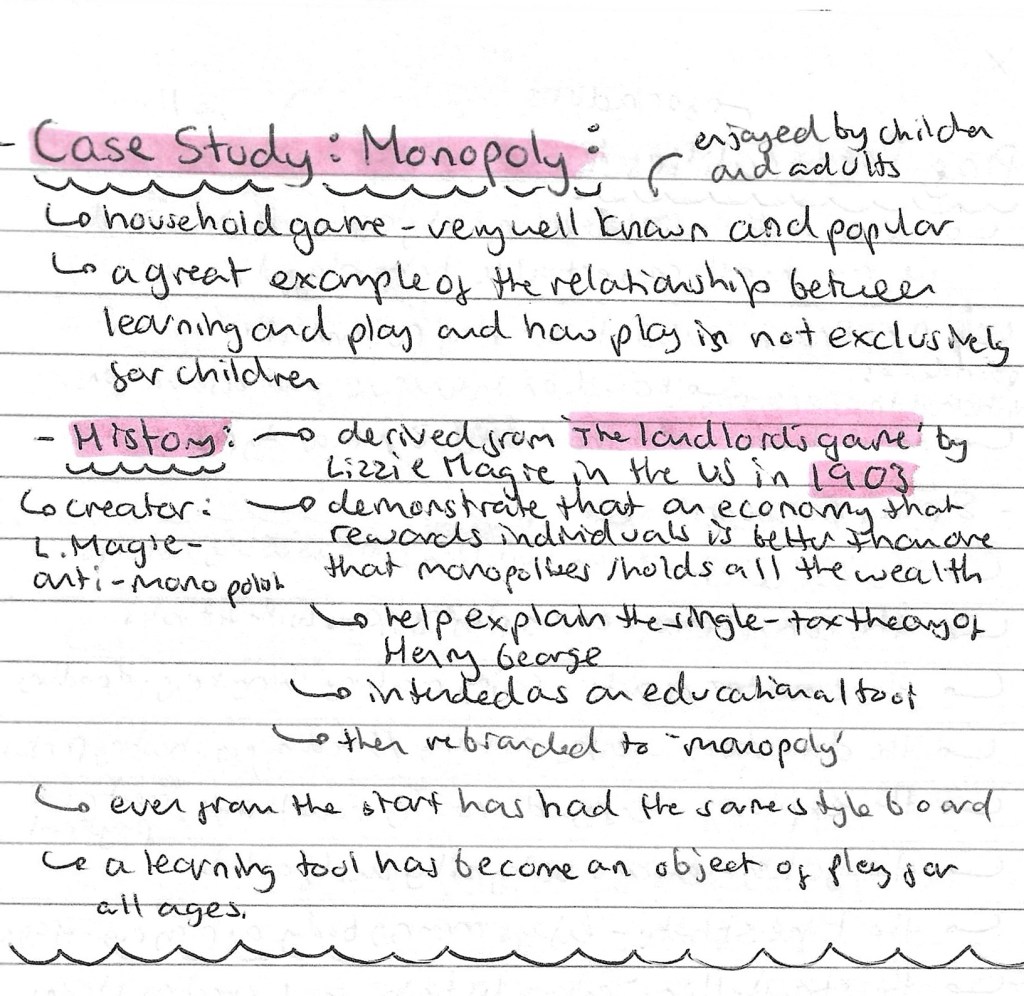 I wanted to pick a famous and popular game to study as board games are one of the first types of ‘play’ that I thought of during our group discussion and is something I’m considering basing my project around. I chose to research Monopoly and found it has an interesting history, starting out as an educational tool and later becoming a game. This is a good example of the fundamental connection between play and learning at all ages.